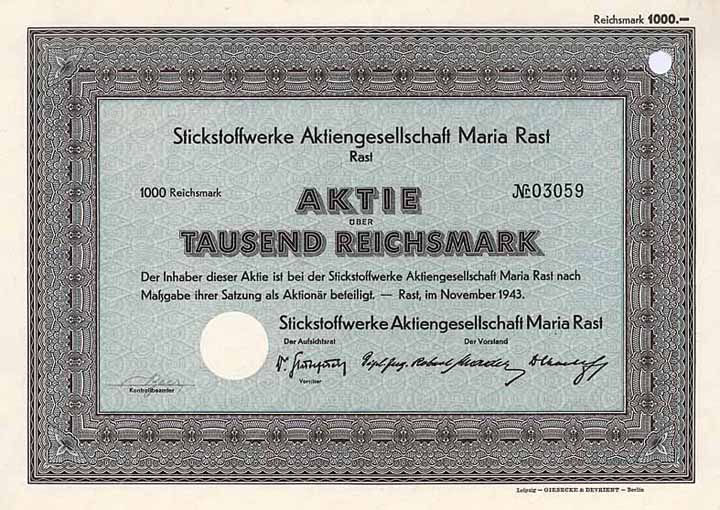 | Vorheriges Los | Zurück | Nächstes Los | | Losnr.: | 1217 (Deutschland) | | Titel: | Stickstoffwerke AG Maria Rast | | Auflistung: | Aktie 1.000 RM Nov. 1943 (Auflage 4000, R 7). | | Ausruf: | 28,00 EUR | Ausgabe- datum: | 01.11.1943 | Ausgabe- ort: | Rast | | Abbildung: |  | | Stücknr.: | 3060 | | Info: | Chemiefabrik bei Marburg/Drau in der Untersteiermark (Kroatien), gegründet 1916. Erzeugt wurden Karbid, Kalkstickstoff, Ferrochrom und Sauerstoff. | | Besonder-heiten: | Lochentwertet (RB). | | Verfügbar: | R 7 | | Erhaltung: | EF | | Zuschlag: | offen |