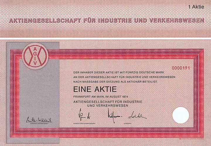 | Vorheriges Los | Zurück | Nächstes Los | | Losnr.: | 71 (Deutschland) | | Titel: | AG für Industrie und Verkehrswesen | | Auflistung: | Aktie 50 DM Aug. 1974 (R 6). | | Ausruf: | 20,00 EUR | Ausgabe- datum: | 01.08.1974 | Ausgabe- ort: | Frankfurt/M. | | Abbildung: |  | | Stücknr.: | 1407223 | | Info: | Gründung 1881 in Dortmund als “Deutsche Local- und Straßenbahngesellschaft”. 1890 Umfirmierung in “Allgemeine Lokal- und Straßenbahn-Ges.”, zugleich Sitzverlegung nach Berlin. 1923 erneut Umfirmierung in “Allgemeine Lokalbahn- und Kraftwerke AG”. Neben einer großen Zahl eigener Bahnbetriebe war die Aloka mehrheitlich beteiligt bei der Straßen-Eisenbahn-Ges. Braunschweig, der Danziger Elektrischen Straßenbahn-AG, der Düsseldorf-Duisburger Kleinbahn, der Stadtbahn in Halle, der Straßenbahn Halle-Merseburg, der Ges. für Straßenbahnen im Saartal, der Straßburger Straßenbahn-Ges. und der Zahnradbahn auf den Petersberg bei Bonn. 1974 Verschmelzung mit der 1901 gegründeten AG für Verkehrswesen (in der zuvor 1927 die Allgemeine Dt. Eisenbahn-AG, 1928 die Westdeutsche Eisenbahnges. AG, Köln und 1929 die Deutsche Eisenbahn-Ges., Frankfurt/M. aufgegangen waren) zur AGIV. Lange Zeit der bedeutendste deutsche Kleinbahn-Konzern, später gewannen die Beteiligungen im Bau- und Maschinenbau- und Energiebereich (Wayss & Freytag AG. H. Klammt AG, Carl Schenck AG, O & K Orenstein & Koppel AG, Barmag AG, Kraftanlagen AG Heidelberg, Württ. Elektrizitäts-AG, Münchener Baugesellschaft mbH) größere Bedeutung. Nach Verkauf fast aller Nicht-Immobilien-Beteiligungen trennte sich die BHF-Bank 2001 von ihrer jahrzehntelangen Mehrheit, kurz darauf Verschmelzung mit der HBAG Real Estate AG in Hamburg und Umfirmierung in AGIV Real Estate AG. | | Verfügbar: | Rückseitig laserdruckentwertet. (R 6) | | Erhaltung: | EF+ | | Zuschlag: | 20,00 EUR |