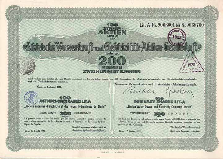 | Vorheriges Los | Zurück | Nächstes Los | | Losnr.: | 1408 (Österreich) | | Titel: | Steirische Wasserkraft- und Elektrizitäts-AG | | Auflistung: | Aktie 100 x 200 Kr. 1.8.1922. | | Ausruf: | 75,00 EUR | Ausgabe- datum: | 01.08.1922 | Ausgabe- ort: | Graz | | Abbildung: |  | | Stücknr.: | 9068501-9068600 | | Info: | Gründung 1921 zwecks Ausbau der steirischen Wasserkräfte. Im Laufe der Jahrzehnte wurden über 20 Wasserkraftwerke an der Teigitsch, der Mur und der Enns errichtet, außerdem ab 1958 die Dampfkraftwerke Pernegg und Neudorf-Werndorf sowie ab 1963 das Fernheizkraftwerk Graz. Börsennotiert in Wien, 1947 verstaatlicht. Die STEWEAG versorgt noch heute den größten Teil der Steiermark mit Strom. | | Besonder-heiten: | Sehr dekorativ im Jugendstil gestaltetes Papier, dreisprachig deutsch/französisch/englisch. | | Verfügbar: | Mit kpl. Kuponbogen. Doppelblatt, rückseitig ein Einriss. | | Erhaltung: | VF | | Zuschlag: | offen |