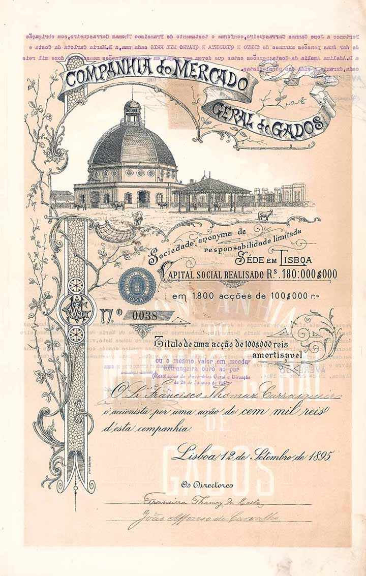 | Vorheriges Los | Zurück | Nächstes Los | | Losnr.: | 1425 (Portugal) | | Titel: | Cia. do Mercado Geral de Gados | | Auflistung: | Accao 100$000 Rs. 12.9.1895 (Auflage 1800). | | Ausruf: | 80,00 EUR | Ausgabe- datum: | 12.09.1895 | Ausgabe- ort: | Lissabon | | Abbildung: |  | | Stücknr.: | 15 | | Info: | Die Gesellschaft betrieb den Handel mit landwirtschaftlichem Nutzvieh. Erst 1963 in Liquidation gegangen. | | Besonder-heiten: | Grossformatig, herrliche Gestaltung mit mehreren Rindern auf einem großen umzäunten Platz und einer großen, als Oktagon mit Kuppel ausgebildeten Viehmarkthalle. | | Erhaltung: | VF+ | | Zuschlag: | offen |