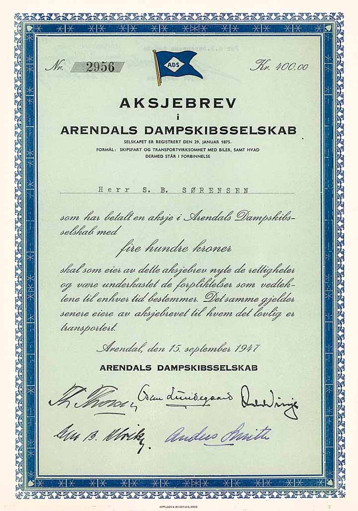 | Vorheriges Los | Zurück | Nächstes Los | | Losnr.: | 1377 (Norwegen) | | Titel: | Arendals Dampskibsselskab | | Auflistung: | Aktie 400 nkr 15.9.1947. | | Ausruf: | 38,00 EUR | Ausgabe- datum: | 15.09.1947 | Ausgabe- ort: | Arendal | | Abbildung: |  | | Stücknr.: | 400 | | Info: | Gründung der Dampfschifffahrtsges. bereits 1875. | | Besonder-heiten: | Oben Abb. der Reedereiflagge. | | Erhaltung: | EF | | Zuschlag: | offen |