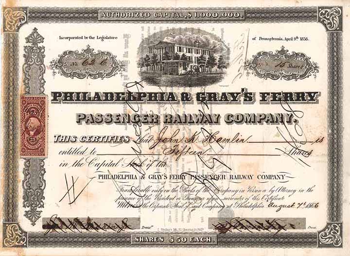 | Vorheriges Los | Zurück | Nächstes Los | | Losnr.: | 1718 (USA) | | Titel: | Philadelphia & Gray's Ferry Passenger Railway | | Auflistung: | 84 shares à 50$ 4.10.1871. | | Ausruf: | 46,00 EUR | Ausgabe- datum: | 07.08.1866 | Ausgabe- ort: | Philadelphia | | Abbildung: |  | | Stücknr.: | 4380 | | Info: | Pferdebahn, gegründet am 9.4.1858, Strecke von 7 Meilen Länge. | | Besonder-heiten: | Herrliche Vignette mit feiner Darstellung einer Pferdestraßenbahn. | | Verfügbar: | Handschriftlich mit Kreuz- und Wellenstrichen entwertet. | | Erhaltung: | VF | | Zuschlag: | offen |