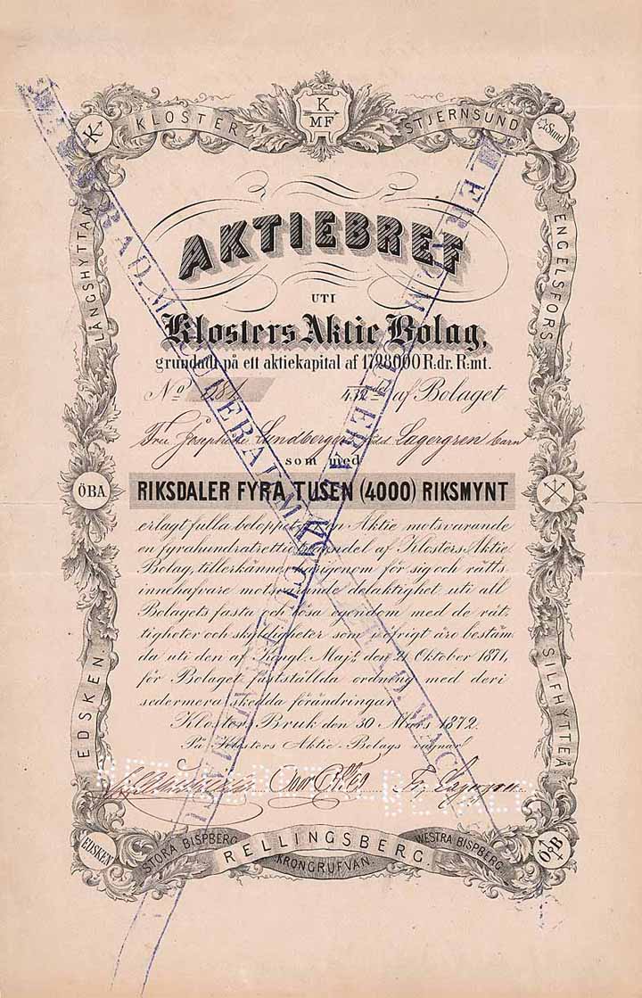 | Vorheriges Los | Zurück | Nächstes Los | | Losnr.: | 1480 (Schweden) | | Titel: | Klosters AB | | Auflistung: | Aktie 4.000 Riksdaler 30.3.1872. Gründeraktie (Auflage 432). | | Ausruf: | 200,00 EUR | Ausgabe- datum: | 30.03.1872 | Ausgabe- ort: | Klosters Fabrik | | Abbildung: |  | | Stücknr.: | 52 | | Info: | Gegründet 1871 mit einem Kapital von 1.728.000 Riksdaler für den Betrieb eines Eisenwerkes mit Hochofen, Martins- und Bessemerwerk, Elektrostahlabt. und Gießerei. 1918 Zusammenschluss mit Stockholms Kullager AB, 1923 umbenannt in Langshyttans. Heute aufgeteilt u.a. in Kloster Speedsteel AB und Erasteel Kloster AB, einem der weltgrößten Produzenten von Schnellarbeitsstahl (HSS). | | Besonder-heiten: | Großformatiges Papier, sehr dekorativ gestaltet mit Angaben der einzelnen Werke. Namenspapier, mehrfach original signiert. | | Verfügbar: | Randeinrisse rechtsseitig restauriert. Kulturgeschichtlich hochbedeutende Rarität zur europäischen Industriegeschichte in ihrer Geburtsstunde. | | Erhaltung: | VF | | Zuschlag: | 200,00 EUR n |