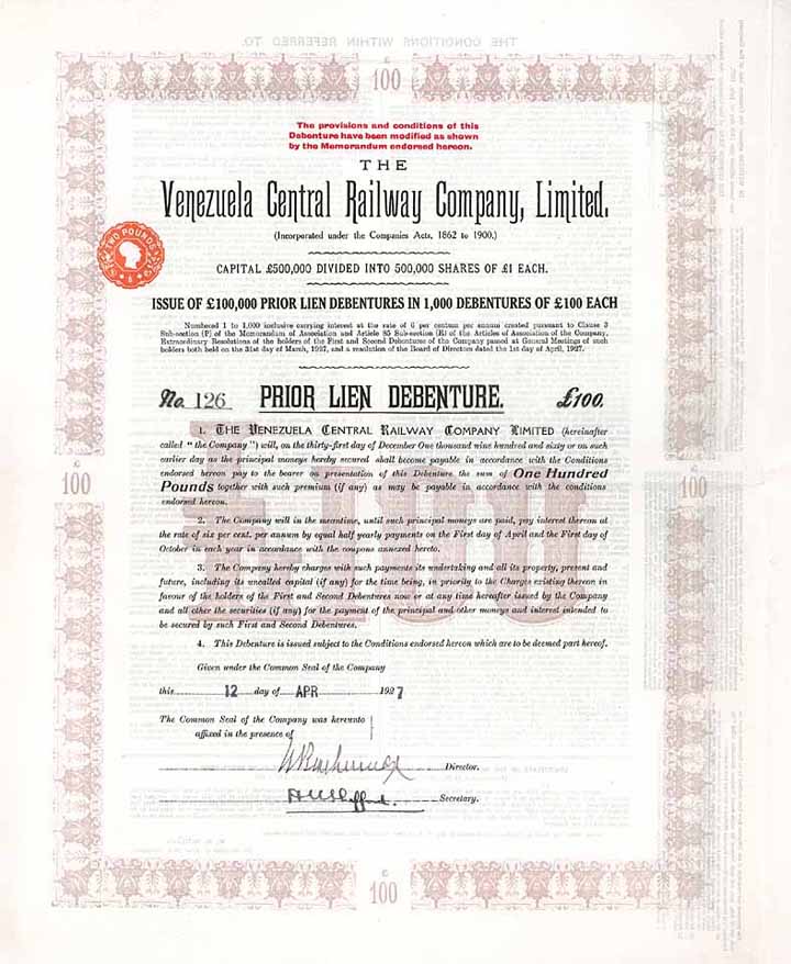 | Vorheriges Los | Zurück | Nächstes Los | | Losnr.: | 1830 (Venezuela) | | Titel: | Venezuela Central Railway | | Auflistung: | 6 % Debenture 100 £ 12.4.1927 (Auflage 1000). | | Ausruf: | 44,00 EUR | Ausgabe- datum: | 12.04.1927 | Ausgabe- ort: | Venezuela | | Abbildung: |  | | Stücknr.: | 80 | | Info: | Die Eisenbahn wurde 1905 eingetragen und besaß die Konzession von der Venezuelanischen Regierung für 99 Jahre von Febr. 1885 an. Die Linie nach Arenanza (26 Meilen) war 1908 fertiggestellt. Ein kleines Teilstück (7 Meilen) von Caracas nach Petare war 1908 bereits elektrifiziert. Das gesamte Eisenbahnnetz (1953 noch 1083 km) ist (1970) bis auf 175 km stillgelegt worden. | | Verfügbar: | Kupons anhängend. Knickfalte, sonst tadellos. | | Erhaltung: | EF- | | Zuschlag: | offen |