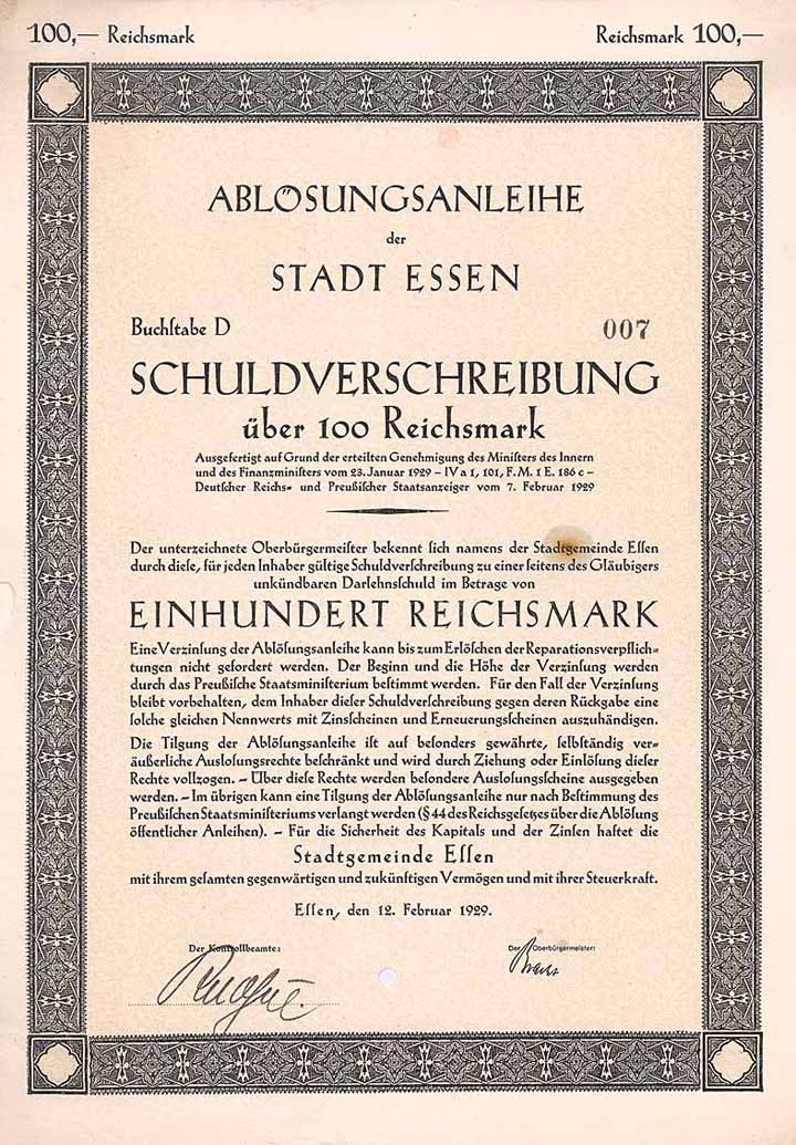 | Vorheriges Los | Zurück | Nächstes Los | | Losnr.: | 812 (Deutschland) | | Titel: | Stadt Essen | | Auflistung: | Schuldv. 100 RM 12.2.1929 (R 9). | | Ausruf: | 60,00 EUR | Ausgabe- datum: | 12.02.1929 | Ausgabe- ort: | Essen | | Abbildung: |  | | Stücknr.: | 4 | | Besonder-heiten: | Ablösungsanleihe. Lochentwertet (RB). | | Verfügbar: | Nur 6 Stück lagen im Reichsbankschatz. (R 9) | | Erhaltung: | EF-VF | | Zuschlag: | offen |
