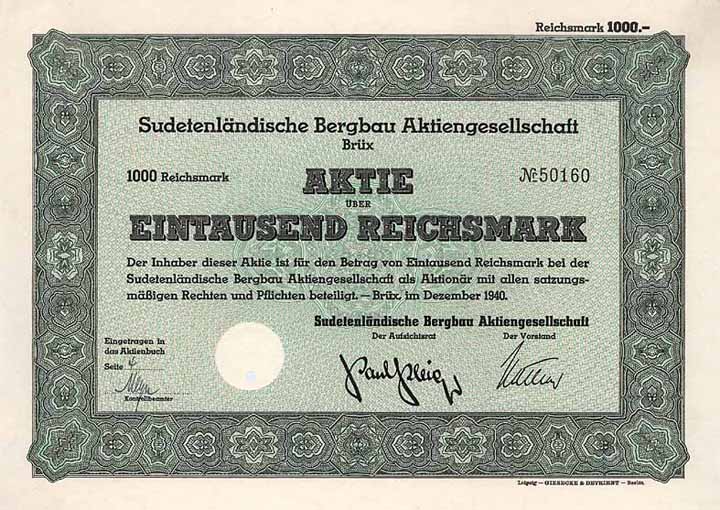 | Vorheriges Los | Zurück | Nächstes Los | | Losnr.: | 850 (Deutschland) | | Titel: | Sudetenländische Bergbau AG | | Auflistung: | Aktie 1.000 RM Dez. 1940 (Auflage 30000, R 11). | | Ausruf: | 120,00 EUR | Ausgabe- datum: | 01.12.1940 | Ausgabe- ort: | Brüx | | Abbildung: |  | | Stücknr.: | 50167 | | Info: | Gründung 1939 durch das Deutsche Reich (Staatliche Bergdirektion Brüx), die Böhmische Handelsgesellschaft in Prag, die Reichswerke AG für Erzbergbau und Eisenhütten “Hermann Göring” und die Dresdner Bank, wobei die ersteren beiden ihre im Sudetenland betriebenen Bergwerke einbrachten. Weiter übernommen wurden Ende 1939 die Nordböhmische Kohlenwerks-Gesellschaft und die Brüxer Kohlen-Bergbau-Gesellschaft sowie 1940 die AG Grube Poseidon und die AG Grube Minerva (beide in Brüx). Außerdem an einer Sprengstofffabrik beteiligt. Börsennotiz Berlin. | | Besonder-heiten: | Faksimile-Unterschrift als AR-Vorsitzender Paul Pleiger (Vorstandsvors. der Reichswerke AG für Erzbergbau und Eisenhütten “Hermann Göring”, ab 1943 “Reichsbeauftragter für die gesamte Wirtschaft des Ostens”). Lochentwertet (RB). | | Verfügbar: | Nur 2 Stück lagen im Reichsbankschatz. (R 11) | | Erhaltung: | VF | | Zuschlag: | 140,00 EUR |