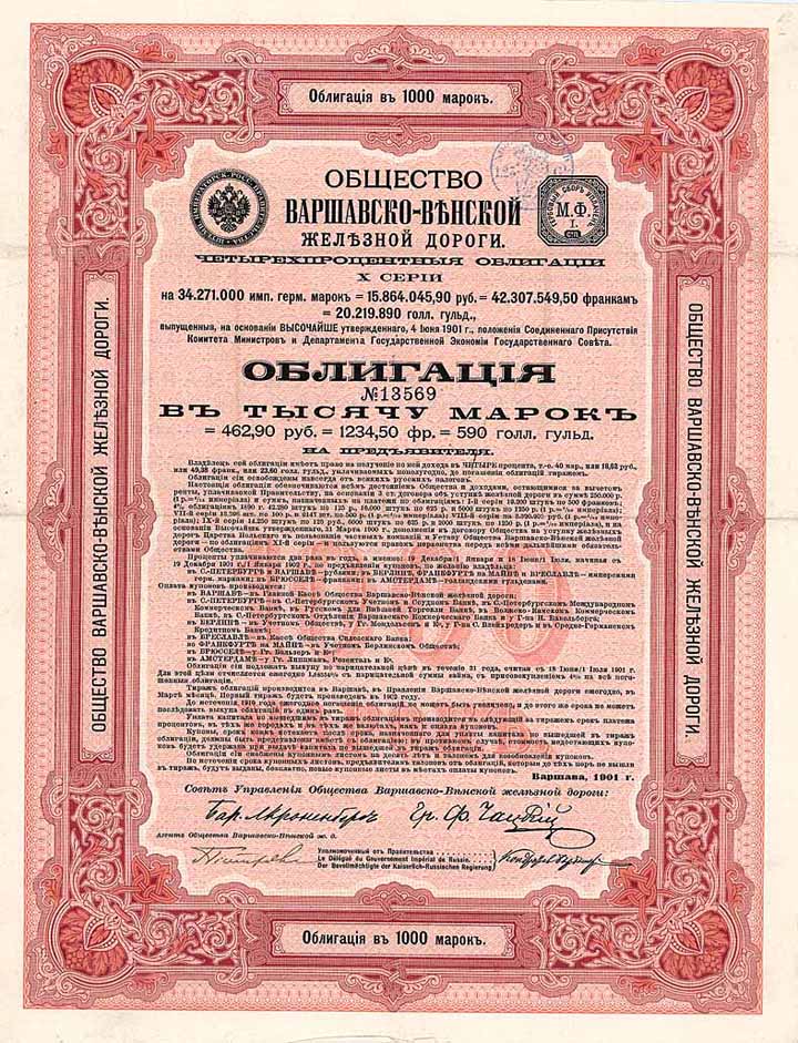 | Vorheriges Los | Zurück | Nächstes Los | | Losnr.: | 1173 (Polen) | | Titel: | Warschau-Wiener Eisenbahn-Gesellschaft | | Auflistung: | 4% Obl. 1.000 Mark = 462,90 Rbl. von 1901 (D/H SU E 1156b, R2). | | Ausruf: | 20,00 EUR | Ausgabe- datum: | 01.01.1901 | Ausgabe- ort: | Warschau | | Abbildung: |  | | Stücknr.: | 1251 | | Info: | Zweitälteste russische Eisenbahn (älter war nur die kurze 27 km lange Strecke von St. Petersburg nach Zarskoje Selo). Die Warschau-Wiener Eisenbahn war eine Eisenbahngesellschaft in Kongresspolen, das zum russischen Reich gehörte. Die Stammstrecke führte von Warschau bis an die damalige österreichische Grenze bei Sosnowiec und entspricht damit zu großen Teilen der heutigen Linie Nr. 1 (Warszawa-Katowice) der polnischen Staatsbahn PKP. Sie war die erste Fernbahn des Zarenreiches! Sie bildete den russisch-polnischen Teil des Sterns von Bahnstrecken, der schon Mitte des 19. Jahrhunderts Berlin, Wien und Warschau über das damalige Dreiländereck bei Krakau miteinander verband. Das Projekt, Warschau durch eine Bahnlinie mit der österreichischen Grenze zu verbinden, entstand 1835. Die Konzession zum Bau eines Schienenwegs von Warschau zur österreichischen Grenze in der Richtung auf Wien, der anfänglich als Pferdebahn mit Flachschienen und Langschwellen geplant gewesen, wurde 1838 an Peter A. Steinkeller und Konsorten erteilt; das Statut der Warschau-Wiener Eisenbahngesellschaft gegen Zusicherung einer 4%igen staatlichen Zinsengarantie für die Aktien 1839 bestätigt. Der bedeutende Warschauer Bankier und Geschäftsmann Peter A. Steinkeller (1799-1854) wurde dabei tatkräftig von dem Grafen Henryk Lubienski unterstützt. Nach Steinkellers Tod 1854 übernahm der jüdische Bankier Leopold Kronenberg (1812-1878) als Präsident die Leitung der Warschau-Wiener Eisenbahngesellschaft. Der Bau der Bahn, ausgeführt mit hochkantigen Schienen und Querschwellen für Dampfbetrieb, wurde bereits im Gründungsjahr begonnen. Die Gesellschaft stieß allerdings auf Schwierigkeiten bei Unterbringung ihrer Aktien und konnte die Mittel für den Weiterbau nicht beschaffen; da ferner das für einen Schienenweg mit tierischem Betrieb veranschlagte Kapital für den Bau einer Bahn mit Dampfbetrieb nicht ausreichte und eine Vergrößerung desselben nicht genehmigt wurde, löste sich die Gesellschaft 1842 auf. Am 4. Juli 1843 übernahm die Regierung Kongresspolens die Verwaltung der Warschau-Wiener Eisenbahn, und 1844 wurden die Arbeiten wieder aufgenommen. Im November des Jahres wurde der erste Abschnitt von Warschau nach Pruszków mit einer Zugfahrt des Gouverneurs von Kongresspolen eröffnet. Am 14. Juni 1845 wurde die Strecke bis Grodzisk Mazowiecki fertiggestellt, am 15. Oktober des Jahres bis Skierniewice und Lowicz, am 1. Dezember 1846 bis Czestochowa und am 1. April 1848 bis zum Bahnhof "Granica", (d. h. "Grenze") vor der österreichischen Grenze im Waldgebiet Maczki östlich von Sosnowiec. Noch im selben Jahr fertig wurde die Eisenbahnbrücke über den damaligen Grenzfluss Biala Przemsza zum Bahnhof Szczakowa an der am 13. Oktober 1847 in Betrieb gegangenen Krakau-Oberschlesischen Eisenbahn, die in Myslowitz (poln. Myslowice) Anschluss an die Oberschlesische Eisenbahn nach Breslau hatte. Am 1. September 1848 wurde diese über die Wilhelmsbahn vom Bahnhof Kosel in Kandrzin nach Oderberg (Bohumín) mit der Kaiser-Ferdinands-Nordbahn nach Wien verbunden. Eine Verbindung von Trzebinia in der Nähe von Krakau über österreichisches Gebiet zur Nordbahn kam erst 1856 zustande. Der Wiener Bahnhof in Warschau wurde 1845 eröffnet und blieb bis in die 1920er Jahre in Betrieb. Zwischen 1859 und 1862 wurden zwei direkte Verbindungen zum preußischen Bahnnetz hergestellt, von Sosnowitz nach Kattowitz und von Aleksandrów Kujawski nach Thorn. 1866 wurde eine Anschlussbahn von Koluszki nach Lódz gebaut. Von 1857 bis 1912 war die Strecke an die deutsch-belgische Warschau-Wiener Eisenbahn AG verpachtet.