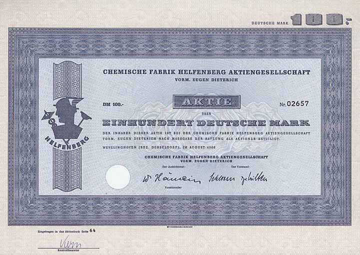 | Vorheriges Los | Zurück | Nächstes Los | | Losnr.: | 300 (Deutschland) | | Titel: | Chemische Fabrik Helfenberg AG vorm. Eugen Dietrich | | Auflistung: | Aktie 100 DM Aug. 1966 (Auflage 7440, R 2). | | Ausruf: | 10,00 EUR | Ausgabe- datum: | 01.08.1966 | Ausgabe- ort: | Wevelinghoven (Bez. Düsseldorf) | | Abbildung: |  | | Stücknr.: | 704 | | Info: | Gründung 1869, AG seit 1898. Herstellung von chemisch-pharmazeutischen Präparaten (u.a. das Farnotän-Bandwurmmittel). Börsennotiz Dresden/Leipzig. 1951 wurde das Werk in Helfenberg (Krs. Dresden) enteignet und in VEB Chemische Fabrik Helfenberg umgewandelt (umgangssprachlich als die Chemische bezeichnet). Ab 1955 Betriebsteil des VEB Pentacon, dem bedeutenden Fotokamerahersteller in Dresden. 1953 Sitzverlegung nach Wevelinghoven (Bez. Düsseldorf), wo bereits seit 1915 die 100 %ige Tochter "Chemische Gesellschaft Rhenania mbH" ansässig war. 1974 ging die Chemiefabrik in Wevelinghoven, das ein Jahr später zu einem Stadtteil Grevenbroichs wurde, durch einen Aktientausch der Varta AG in der Byk Gulden Lomberg Chemische Fabrik GmbH, Konstanz auf. 2002 erfolgte die Umbenennung in Altana Pharma AG. Der Altana-Konzern gliederte sich bis 2007 in die Pharmasparte Altana Pharma AG mit Sitz in Konstanz und in die Spezialchemiesparte Altana Chemie AG mit Sitz in Wessel. Die Pharmasparte wurde im Dez. 2006 an die dänische Nycomed verkauft. Seit dem gibt es keine Spartentrennung mehr, sondern nur noch die Altana AG, welche ausschließlich in der Spezialchemie operiert. Der Standort in Grevenbroich ist heute Teil des Altana-Konzerns. | | Verfügbar: | Unentwertet. (R 2) | | Erhaltung: | EF | | Zuschlag: | 11,00 EUR |