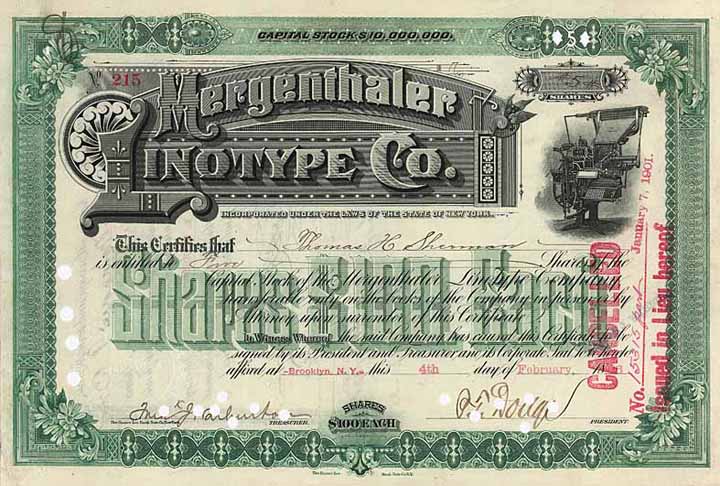 | Vorheriges Los | Zurück | Nächstes Los | | Losnr.: | 1486 (USA) | | Titel: | Mergenthaler Linotype Co. | | Auflistung: | 4 shares à 100 $ 4.2.21896. | | Ausruf: | 60,00 EUR | Ausgabe- datum: | 04.02.1896 | Ausgabe- ort: | Brooklyn | | Abbildung: |  | | Stücknr.: | 230 | | Info: | Gründung 1895. Der Uhrmacher Ottmar Mergenthaler (geb. 1854 in Bachtel/Württ., gest. 1899 in Baltimore) wanderte 1872 in die USA aus und erfand 1884 die “Linotype”, die erste Setzmaschine zum Gießen ganzer Schriftzeilen. Bis dahin mussten Texte mühsam von Hand gesetzt werden, so dass diese Erfindung den Buchdruck vollkommen revolutionierte. Bis Ende der 20er Jahre waren ca. 40.000 dieser Maschinen in den USA und ca. 15.000 im Rest der Welt im Einsatz. 1909 wurde in Deutschland auch die Mehrheit an der Mergenthaler Setzmaschinenfabrik GmbH erworben. | | Besonder-heiten: | Dekorativer Stahlstich, schöne Abb. einer Linotype. Mit Originalsignatur von Philip T. Dodge (1851-1931) als Präsident. Dodge war ursprünglich ein Patentanwalt, tätig für Remington Typewriter Company. Seine Technikbegeisterung bewog ihm sich beruflich zu verändern. | | Erhaltung: | EF | | Zuschlag: | offen |