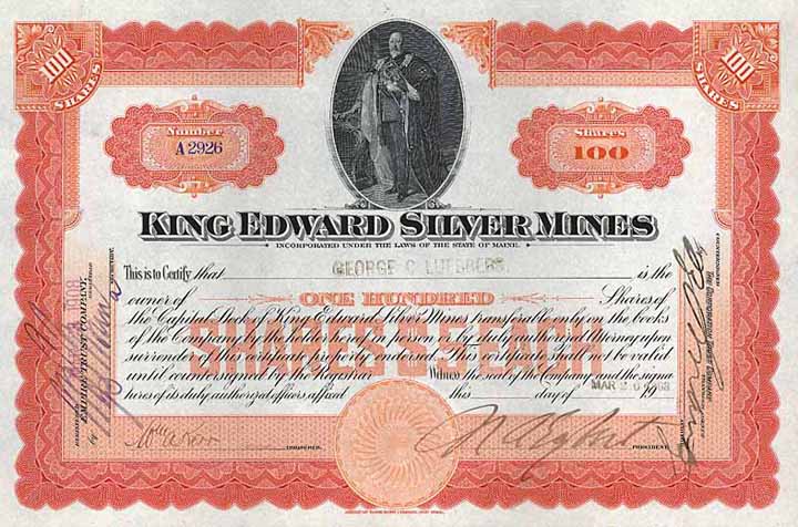 | Vorheriges Los | Zurück | Nächstes Los | | Losnr.: | 1462 (USA) | | Titel: | King Edward Silver Mines | | Auflistung: | 100 shares à 5 $ 20.3.1908. | | Ausruf: | 60,00 EUR | Ausgabe- datum: | 20.03.1908 | | Abbildung: |  | | Stücknr.: | 2926 | | Info: | Registriert 1906 mit juristischem Sitz im US-Bundesstaat Maine. | | Besonder-heiten: | Orange/schwarzer ABNC-Stahlstich mit ovaler Vignette: King Edward VII (1841-1910) in majestätischer Pose. | | Verfügbar: | Sehr selten. Unentwertet. | | Erhaltung: | EF | | Zuschlag: | offen |