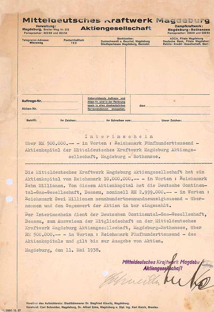 | Vorheriges Los | Zurück | Nächstes Los | | Losnr.: | 730 (Deutschland) | | Titel: | Mitteldeutsches Kraftwerk Magdeburg AG | | Auflistung: | Interimsschein 500.000 RM 11.5.1938 (R 12) für die Deutsche Continental-Gas-Gesellschaft, Dessau, die sich mit insgesamt 2,999 Mio. RM am Kapital von 10 Mio. RM beteiligt hatte. | | Ausruf: | 260,00 EUR | Ausgabe- datum: | 11.05.1938 | Ausgabe- ort: | Magdeburg | | Abbildung: |  | | Info: | Gründung 1929 zum Bau des Dampfkraftwerks Magdeburg-Rothensee auf dem Gelände des Mittellandkanalhafens. Aktionäre waren die Elektrowerke AG in Berlin (50,01 %), die Stadt Magdeburg (20 %) und die Deutsche Contigas (29,99 %). Mitte 1939 wurde das Kraftwerk für 30 Jahre an die Elektrowerke AG verpachtet. Auch damals gab es schon ein bißchen Finanzakrobatik: Eine 1930 in den USA aufgelegte Anleihe von 4 Mio. $ konnte bei Fälligkeit 1934 wegen der deutschen Devisenbestimmungen nicht zurückgezahlt werden. Kurzerhand nahm die Ges. dann in der Schweiz ein Franken-Darlehen auf, kaufte damit den größten Teil der Dollaranleihe (übrig blieben nur 145.050 $) freihändig am Markt zu Kursen weit unter pari zurück und machte so einen sehr netten Extra-Gewinn. | | Besonder-heiten: | Maschinenschriftliche Ausführung auf einem Geschäftsbriefbogen der Gesellschaft, Originalunterschriften. Lochentwertet (RB). | | Verfügbar: | Einzelstück aus dem Reichsbankschatz. Randschäden fachgerecht restauriert. (R 12) | | Erhaltung: | VF | | Zuschlag: | 260,00 EUR |