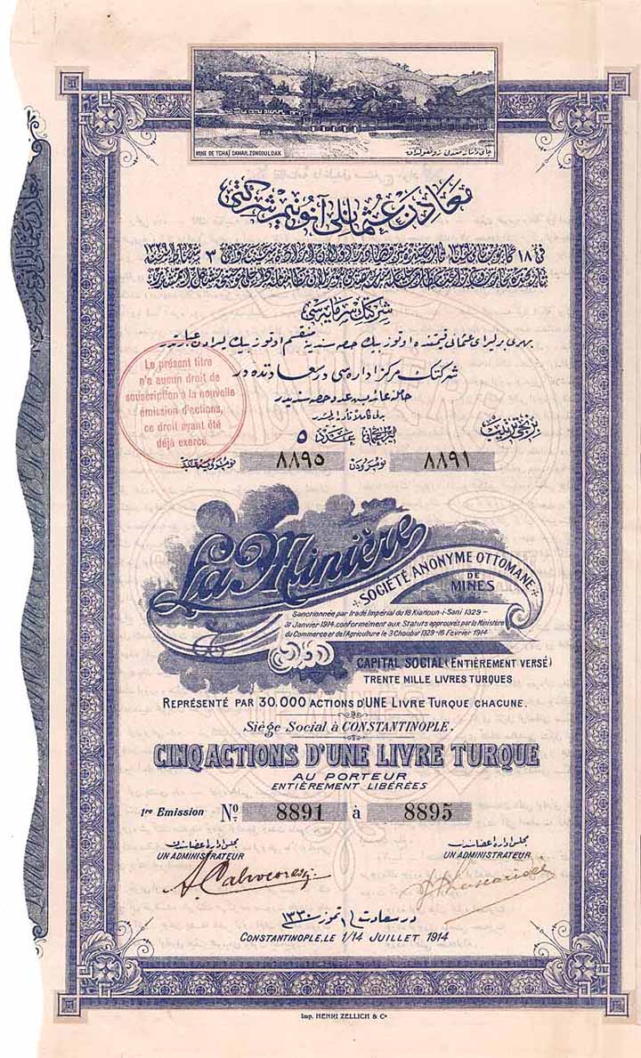 | Vorheriges Los | Zurück | Nächstes Los | | Losnr.: | 1368 (Türkei) | | Titel: | La Minière S.A. Ottomane de Mines | | Auflistung: | Aktie 5 x 1 £ tq. 14.7.1914. Gründeraktie (nicht im D/H-Katalog). | | Ausruf: | 75,00 EUR | Ausgabe- datum: | 14.07.1914 | Ausgabe- ort: | Constantinopel | | Abbildung: |  | | Stücknr.: | 119 | | Info: | Die 1914 gegründete Gesellschaft betrieb das Tchaj-Damar-Bergwerk bei Zonguldak (im Nordwesten der Türkei am Schwarzen Meer). Noch heute beruht die Wirtschaft der Stadt Zonguldak (zugleich Hauptstadt der gleichnamigen Provinz in Anatolien) hauptsächlich auf dem Steinkohle-Bergbau, und die entsprechende Erfahrung ist auch der Grund, warum heute etwa 30 % der ursprünglichen Einwohner dieser Region im Ruhrgebiet leben. | | Besonder-heiten: | Sehr dekorativ, mit Abb. des Bergwerks. Zweisprachig ottomanisch/französisch. | | Verfügbar: | Kupons kpl. anhängend. | | Erhaltung: | EF-VF | | Zuschlag: | offen |