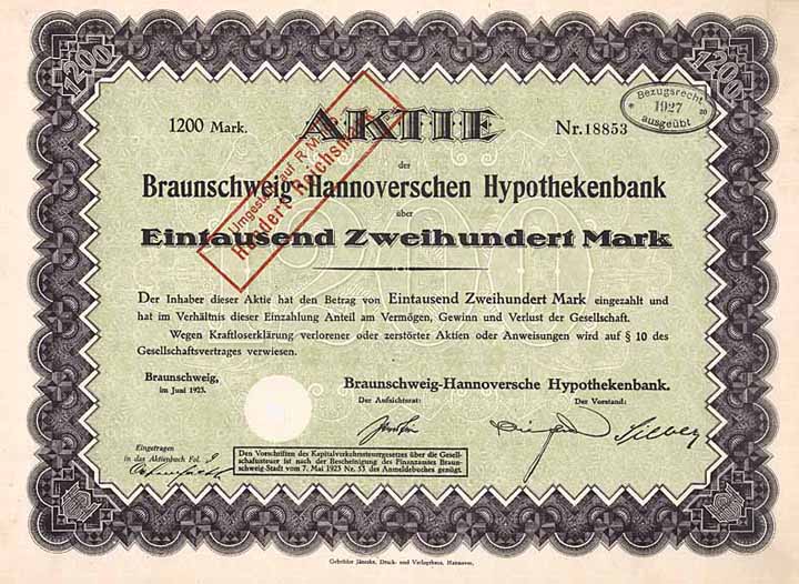 | Vorheriges Los | Zurück | Nächstes Los | | Losnr.: | 202 (Deutschland) | | Titel: | Braunschweig-Hannoversche Hypothekenbank | | Auflistung: | Aktie 1.200 Mark Juni 1923 (Auflage 3250, R 2). | | Ausruf: | 26,00 EUR | Ausgabe- datum: | 01.06.1923 | Ausgabe- ort: | Braunschweig | | Abbildung: |  | | Stücknr.: | 20614 | | Info: | Das einzige Realkreditinstitut, das es in Braunschweig je gab, wurde 1871 gegründet - als eine der wenigen grundsoliden Neugründungen im Boom der ansonsten hochspekulativen “Gründerzeit” (auch während des Gründerkrachs sank der Aktienkurs der in Berlin, Hannover und Braunschweig notierten “Braunen Hanne” kaum unter pari). Zunächst wurde am Bankplatz das vorher der Braunschweigischen Bank gehörige Gebäude übernommen (heute Sitz des Oberlandesgerichts). 1936 Eingliederung der Hannoversche Bodenkredit-Bank in Hildesheim (vorher zur gewerkschaftseigenen Bank der deutschen Arbeit, der späteren BfG gehörig). Großaktionär war zu dieser Zeit die Braunschweigische Staatsbank mit ca. 60 %. 1996 Verschmelzung mit der 1868 gegründeten Berliner Hypotheken- und Pfandbriefbank AG zur "Berlin-Hannoversche Hypothekenbank". Großaktionäre sind jetzt die Bankgesellschaft Berlin (87,7 %) und die NORD/LB (10 %). | | Besonder-heiten: | Schöne Umrandung im Art-Deko-Stil. Lochentwertet (RB). | | Verfügbar: | R 2 | | Erhaltung: | EF-VF | | Zuschlag: | offen |