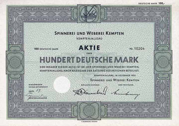 | Vorheriges Los | Zurück | Nächstes Los | | Losnr.: | 932 (Deutschland) | | Titel: | Spinnerei und Weberei Kempten | | Auflistung: | Aktie 100 DM Dez. 1955 (Auflage 2000, R 2). | | Ausruf: | 30,00 EUR | Ausgabe- datum: | 01.12.1955 | Ausgabe- ort: | Kempten/Allgäu | | Abbildung: |  | | Stücknr.: | 10616 | | Info: | Die Gesellschaft wurde 1852 als “Mechanische Baumwoll-Spinn- & Weberei Kempten” gegründet und am 4.5.1938 in “Spinnerei und Weberei Kempten” umbenannt. Der Betrieb liegt im an dieser Stelle tief eingeschnittenen Tal der Iller, deren Wasserkräfte sich die Fabrik zu Nutze machte. Diese für Flugzeuge fast uneinsehbare Lage im tiefen Tal - am Ende waren nämlich wirklich nur zwei Werkswohnhäuser zerstört - war der Grund, warum 1942 die Wehrmacht die Fabrik für ihre Zwecke beschlagnahmte. Die durch die Zweckentfremdung angerichteten Schäden an den Arbeitssälen und den Produktionsmaschinen waren der Grund, warum die Produktion erst im Dez. 1946, über ein Jahr nach Erteilung der Anlaufgenehmigung, wieder in Gang kam, und auch das nur stockend. 1950 war der Wiederaufbau abgeschlossen, 1958 Neubau eines Wasserkraftwerkes. In den 20er Jahren erwarb die Kolbermoor-Union die Aktienmehrheit und übertrug sie später auf ihre Tochterges. Spinnerei und Weberei Pfersee. Am Ende war diese (fast) alleinige Aktionärin - bis auf 7 Aktien im Besitz eines Klosters, das partout nicht zum Verkauf überredet werden konnte. | | Verfügbar: | Rückseitig stempelentwertet. (R 2) | | Erhaltung: | EF | | Zuschlag: | offen |