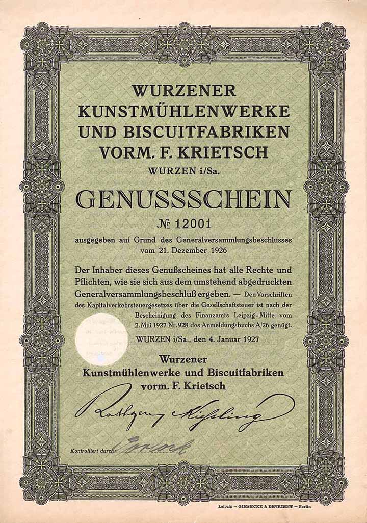 | Vorheriges Los | Zurück | Nächstes Los | | Losnr.: | 1035 (Deutschland) | | Titel: | Wurzener Kunstmühlenwerke und Biscuitfabriken vorm. F. Krietsch | | Auflistung: | Genussschein o.N. 4.1.1927 (R 6). | | Ausruf: | 10,00 EUR | Ausgabe- datum: | 04.01.1927 | Ausgabe- ort: | Wurzen i/Sa. | | Abbildung: |  | | Stücknr.: | 5951 | | Info: | Gründung 1886 unter Übernahme der Firma F. Krietsch (Johann Friedrich Krietsch hatte 1847 die Stadtmühle erworben). Betrieb der Müllerei, der Graupenfabrikation, Hirse- und Erbsenschälerei, Herstellung von Teigwaren, Keksen, Waffeln, Pfefferkuchen. Die Stadtmühle (eine Weizenmühle) wurde 1917 durch Großfeuer völlig zerstört, anschließend wiederaufgebaut. Die 1902 zur Roggenmühle umgebaute am Bahnhof gelegene Schönertmühle (übernommen 1902 von der Wurzener Dampfmühlen-AG vorm. Gust. Schönert, die in Folge des Zusammenbruchs der Leipziger Bank im "Sächsischen Bankenkrach" 1901 insolvent geworden war) brannte 1924 völlig ab, eine neue Roggenmühle wurde dann auf dem Gelände der Stadtmühle errichtet. Nach der Enteignung 1953 als VEB Nahrungsmittelkombinat "Albert Kunz" der größte Lebensmittelhersteller der früheren DDR. 1993 als Wurzener Nahrungsmittel GmbH reprivatisiert, heute zur Getreide AG Rendsburg gehörend.) | | Besonder-heiten: | Lochentwertet (RB). | | Verfügbar: | R 6 | | Erhaltung: | EF+ | | Zuschlag: | 10,00 EUR |