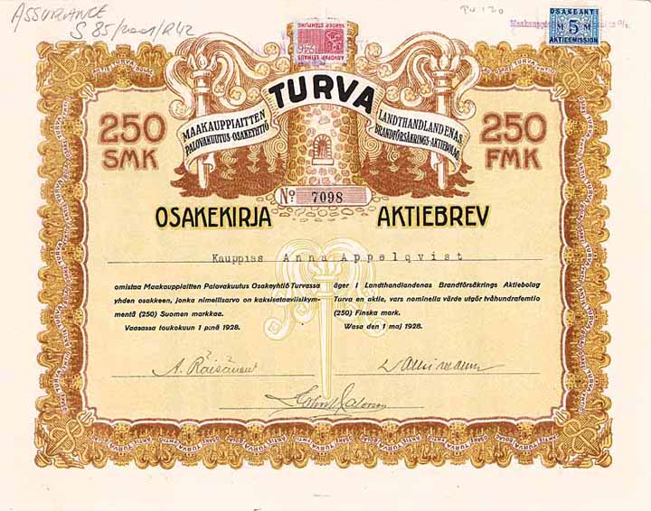 | Vorheriges Los | Zurück | Nächstes Los | | Losnr.: | 867 (Finnland) | | Titel: | Landthandlandenas Brandförsäkrings AB Turva | | Auflistung: | Aktie 250 Fmk. 1.5.1928. | | Ausruf: | 40,00 EUR | Ausgabe- datum: | 01.05.1928 | Ausgabe- ort: | Wasa | | Abbildung: |  | | Stücknr.: | 7098 | | Info: | Finnische Brandversicherungs-Gesellschaft. | | Besonder-heiten: | Sehr dekorativ mit Burgturm, zwei Brandfackeln, Aesculap-Stab in allen vier Ecken. | | Verfügbar: | Doppelblatt, mit Kupons. | | Erhaltung: | EF | | Zuschlag: | offen |