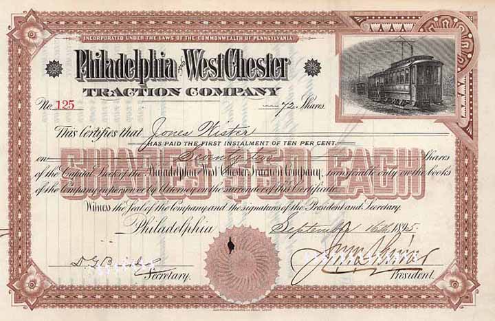 | Vorheriges Los | Zurück | Nächstes Los | | Losnr.: | 1431 (USA) | | Titel: | Philadelphia & West Chester Traction Co. | | Auflistung: | 12 shares à 50 $ 16.9.1895. | | Ausruf: | 40,00 EUR | Ausgabe- datum: | 16.09.1895 | Ausgabe- ort: | Philadelphia, Pa. | | Abbildung: |  | | Stücknr.: | 139 | | Info: | Ursprünglich gegründet als Ardmore Rauilroad Co., 1895 reorganisiert zu Philadelphia & West Chester Traction Company. Die Gesellschaft betrieb eine Straßenbahnlinie von den 63rd. und Market Streets im Westen von Philadelphia nach West Chester. 1902 Eröffnung der Strecke von Llanerch nach Ardmore. 1936 reorganisiert zu Philadelphia Suburban Transportation Co., genannt „Red Arrow Lines“ | | Besonder-heiten: | Braun/schwarzer Druck, Vignette mit elektrischer Straßenbahn. | | Erhaltung: | EF | | Zuschlag: | 42,00 EUR |
