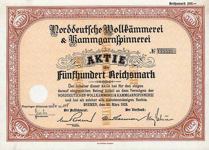 | Vorheriges Los | Zurück | Nächstes Los | | Losnr.: | 535 (Deutschland) | | Titel: | Norddeutsche Wollkämmerei & Kammgarnspinnerei | | Auflistung: | Aktie 500 RM 30.3.1928 (Auflage 6000, R 7). | | Ausruf: | 30,00 EUR | Ausgabe- datum: | 30.03.1928 | Ausgabe- ort: | Bremen | | Abbildung: |  | | Stücknr.: | 135536 | | Info: | Gegründet 1884 von Martin Christian Leberecht Lahusen in Delmenhorst. Um die Jahrhundertwende entwickelte die “Nordwolle” eine hektische Betriebsamkeit und übernahm Dutzende von weiteren Textilbetrieben in ganz Deutschland, außerdem Anlagen in Argentinien, Uruguay und Südafrika. Der schließliche Zusammenbruch 1931 brachte wiederum die kreditgebende Darmstädter und National-Bank zu Fall, was allgemein als Auslöser der Weltwirtschaftskrise in Deutschland angesehen wird. Mit den Werken Delmenhorst, Eisenach, Mühlhausen und Fulda gründete der Konkursverwalter 1932 die "Norddeutsche Woll- und Kammgarn-Industrie AG" als Auffanggesellschaft. | | Verfügbar: | Unentwertet. (R 7) | | Erhaltung: | EF | | Zuschlag: | offen |