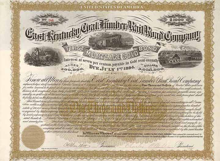| Vorheriges Los | Zurück | Nächstes Los | | Losnr.: | 1380 (USA) | | Titel: | East Kentucky Coal, Lumber & Railroad Co. | | Auflistung: | 7 % Mortgage Gold Bond 1.000 $ 4.5.1874 (Auflage 3000). | | Ausruf: | 180,00 EUR | Ausgabe- datum: | 04.05.1874 | | Abbildung: |  | | Stücknr.: | 29 | | Info: | Die 1874 gegründete Ges. erwarb im Gebiet des wegen seiner vielen Sandbänke Big Sandy River genannten 43 km langen Nebenflusses des Ohio River umfangreiche Rechte für das Schürfen von Kohle und die Rodung von Wäldern. Der Big Sandy River (zugleich Grenze zwischen den Staaten West Virginia und Kentucky) ist zwar schiffbar, mäandert aber sehr stark, so daß für den Abtransport von Kohle aus den Bergwerken der Appalachen eine Eisenbahn eine gute Alternative schien. Trotz aller Werbung (die Ges. gab über die Vorzüge ihrer Kohle- und Holzvorkommen sogar ein dickes Buch heraus) war nach gut einem Jahr aber das Geld alle, ohne daß sich wirtschaftlicher Erfolg eingestellt hatte. | | Besonder-heiten: | Übergroßes Querformat, ganz in gold und schwarz gedruckt mit drei tollen Vignetten: Bergarbeiter unter Tage, Eisenbahn, Flößer. Originalunterschrift Charles H. Wells als President. | | Verfügbar: | Unentwertet, anh. Kupons. | | Erhaltung: | VF | | Zuschlag: | offen |