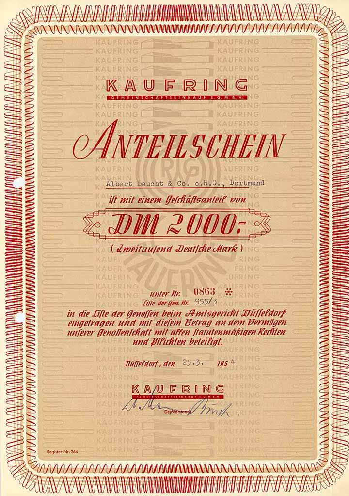 | Vorheriges Los | Zurück | Nächstes Los | | Losnr.: | 949 (Deutschland nach 1945) | | Titel: | Kaufring Gemeinschaftseinkauf eGmbH | | Auflistung: | Anteilschein 2.000 DM 25.3.1954 (R 10). | | Ausruf: | 70,00 EUR | Ausgabe- datum: | 25.03.1954 | Ausgabe- ort: | Düsseldorf | | Abbildung: |  | | Stücknr.: | 863 | | Info: | Gründung 1921 als "Erwege-Großeinkaufsgenossenschaft eGmbH" (Einkaufsgenossenschaft Rheinisch-Westfälischer Geschäftshäuser) durch 28 Kaufleute des rheinisch-westfälischen Haushaltshandels. Nach der Währungsreform 1948 systematischer Neuaufbau unter dem neuen Namen "Kaufring eGmbH". 1988 Umwandlung in die Kaufring AG, 1991 Börsengang. Nach einem Ausgabekurs von 200 DM ging es nur noch bergab, 2002 kam die Insolvenz. | | Besonder-heiten: | Mit Originalunterschriften. | | Verfügbar: | Abheftlochung. (R 10) | | Erhaltung: | EF | | Zuschlag: | 70,00 EUR |