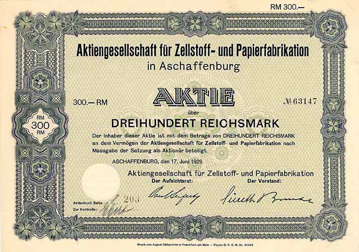 | Vorheriges Los | Zurück | Nächstes Los | | Losnr.: | 48 (Deutschland) | | Titel: | AG für Zellstoff- und Papierfabrikation | | Auflistung: | Aktie 300 RM 17.6.1929 (Auflage 16000, R 6). | | Ausruf: | 30,00 EUR | Ausgabe- datum: | 17.06.1929 | Ausgabe- ort: | Aschaffenburg | | Abbildung: |  | | Stücknr.: | 52250 | | Info: | Gründung 1872 als AG für Maschinenpapier-Fabrikation. Papierfabriken in Aschaffenburg und Memel. Ihren Holzbedarf deckte die Gesellschaft aus mehreren eigenen Waldgütern in Deutschland und Österreich-Ungarn, vor allem aber in Russland in den Gouvernements Pskow, Nowgorod und Oleniz. 1936 umfirmiert in Aschaffenburger Zellstoffwerke AG. 1970 Fusion mit der Zellstofffabrik Waldhof (gegr. 1884) zur PWA Papierwerke Waldhof-Aschaffenburg AG mit Sitz in München. 1998 vom schwedischen Konkurrenten Svenska Cellulosa AB übernommen und in SCA Hygiene Products AG umfirmiert. Das Werk Aschaffenburg-Stockstadt firmierte ab 1999 unter Modo Paper GmbH. 2000: Übernahme des Modo-Konzerns durch die finnische Metsä-Serla. Es entstand die größte Feinpapiergruppe in Europa. 2001: Umfirmierung des Mutterkonzerns in M-real und des Werkes Aschaffenburg-Stockstadt in M-real GmbH. | | Verfügbar: | NICHT lochentwertet. (R 6) | | Erhaltung: | EF | | Zuschlag: | offen |