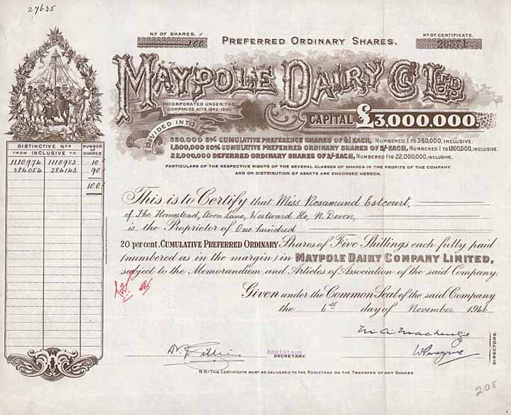 | Vorheriges Los | Zurück | Nächstes Los | | Losnr.: | 1197 (Großbritannien) | | Titel: | Maypole Dairy Co., Ltd. | | Auflistung: | 50 pref. shares à 5 S 10.1.1945. | | Ausruf: | 16,00 EUR | Ausgabe- datum: | 22.11.1946 | | Abbildung: |  | | Stücknr.: | 25823 | | Info: | Gründung 1898 zur Übernahme von Molkereien in Birmingham und Manchester. | | Besonder-heiten: | Großformatig, für englische Verhältnisse ausgesprochen dekorative Gestaltung, Vignette mit jungen Leuten, die um einen Maibaum (maypole) tanzen. | | Erhaltung: | VF+ | | Zuschlag: | offen |