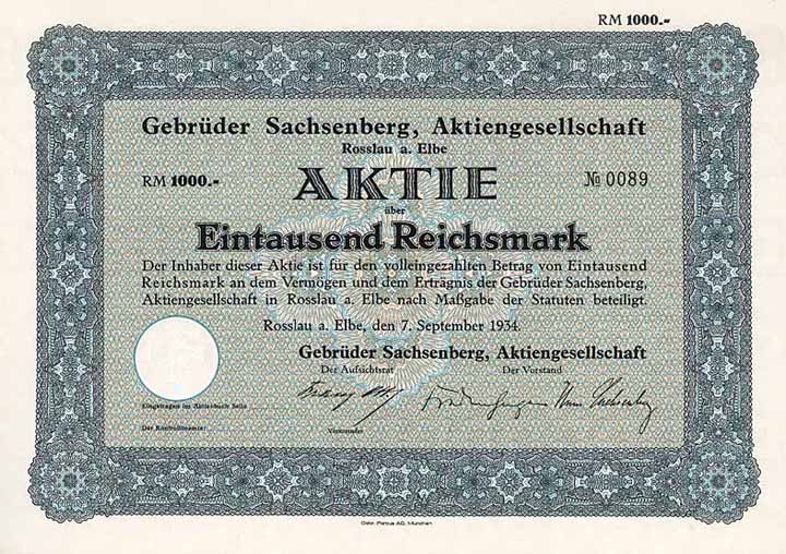 | Vorheriges Los | Zurück | Nächstes Los | | Losnr.: | 219 (Deutschland) | | Titel: | Gebrüder Sachsenberg AG | | Auflistung: | Aktie 1.000 RM 7.9.1934 (Auflage 460, R 5). | | Ausruf: | 50,00 EUR | Ausgabe- datum: | 07.09.1934 | Ausgabe- ort: | Rosslau a. Elbe | | Abbildung: |  | | Stücknr.: | 97 | | Info: | Gründung 1844 als OHG, seit 1908 AG. Schiffswerft für Fluss- und Küstenfahrzeuge, Schnellboote, Schwimmbagger. Außerdem Herstellung von Land- und Schiffskesseln sowie Maschinen für die Spiritus- und Hefe-Erzeugung. Die heutige Roßlauer Schiffswerft GmbH ist eine direkte Nachfolgerin der 1866 gegründeten Schiffswerft Gebr. Sachsenberg. Seit 1994 erfolgte eine Umstrukturierung der Werft vom reinen Schiffbau in eine stahl- und maschinenbauorientierte Fertigung. | | Besonder-heiten: | Lochentwertet (RB). | | Verfügbar: | R 5 | | Erhaltung: | EF | | Zuschlag: | offen |