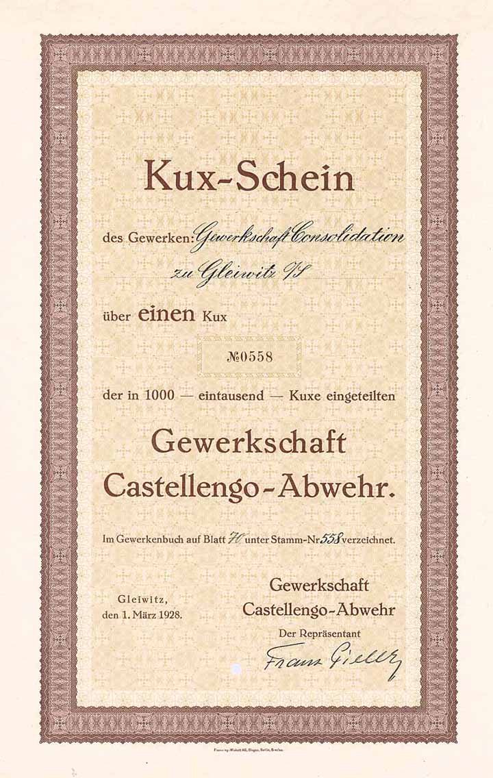 | Vorheriges Los | Zurück | Nächstes Los | | Losnr.: | 237 (Deutschland) | | Titel: | Gewerkschaft Castellengo-Abwehr | | Auflistung: | Kuxschein 1 Kux von 1000 1.3.1928 (Auflage 1000, R 6). | | Ausruf: | 50,00 EUR | Ausgabe- datum: | 01.03.1928 | Ausgabe- ort: | Gleiwitz | | Abbildung: |  | | Stücknr.: | 561 | | Info: | Gründung 1928, um die beiden Steinkohlenbergwerke Castellengo (erschlossen im Jahr 1898) und Abwehr (geteuft in den Jahren 1908/09) aufzunehmen. Die 1000 Kuxe lagen direkt und indirekt vollständig in den Händen der Gräflich Ballestrem'schen Güterverwaltung, davon eine Mehrheit bei der Gewerkschaft Consolidation und eine Minderheit bei der Oberschlesischen Eisenbahn-Bedarfs AG, deren Aktienkapital wiederum mehrheitlich Ballestrem zuzurechnen war. Die Gewerkschaft mit ihren 4 Förderschächten zählte im Jahr 1930 mit einer Förderung von 2,2 Mio. t zu den bedeutendsten Betrieben im oberschlesischen Revier und wurde bis zum Ende des 2. Weltkrieges unter deutscher Leitung erfolgreich weiter betrieben, ehe die Werke an Polen fielen. | | Besonder-heiten: | Lochentwertet (RB). | | Verfügbar: | R 6 | | Erhaltung: | EF | | Zuschlag: | 50,00 EUR |
