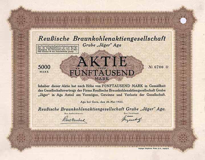 | Vorheriges Los | Zurück | Nächstes Los | | Losnr.: | 495 (Deutschland) | | Titel: | Reußische Braunkohlen-AG Grube "Jäger" Aga | | Auflistung: | Aktie 5.000 Mark 26.5.1923 (Auflage 7000, R 7). | | Ausruf: | 40,00 EUR | Ausgabe- datum: | 26.05.1923 | Ausgabe- ort: | Aga bei Gera | | Abbildung: |  | | Stücknr.: | 6701 | | Info: | Gründung 1923. Erhielt drei Tage nach der Ausgabe den Zusatz "Jäger", da die Grube "Jäger" in Klein-Aga erworben wurde, der Sitz wurde von Leipzig nach Aga verlegt. 1925 Stilllegung des Grubenbetriebs und Liquidation. | | Besonder-heiten: | Lochentwertet (RB). | | Verfügbar: | R 7 | | Erhaltung: | VF | | Zuschlag: | 40,00 EUR |