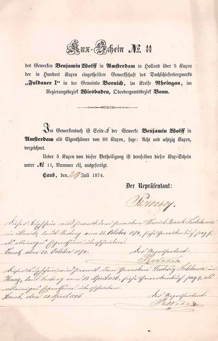 | Vorheriges Los | Zurück | Nächstes Los | | Losnr.: | 193 (Deutschland) | | Titel: | Dachschieferbergwerk “Fuldauer I” | | Auflistung: | Kux-Schein über 10 von 100 Kuxe 29.7.1874 (ausgegeben waren ca. 15 Kux-Scheine, R 10). | | Ausruf: | 240,00 EUR | Ausgabe- datum: | 29.07.1874 | Ausgabe- ort: | Caub | | Abbildung: |  | | Stücknr.: | 12 | | Info: | Das Dachschieferbergwerk in der Gemeinde Bornich wurde von David Isaac Fuldauer gemutet (geboren 1830 im niederländischen Almelo, die Familie war mit den niederländischen Rothschilds verschwägert), der sich mit dem ebenfalls jüdischen Amsterdamer Finanzier Benjamin Wolff als Kapitalgeber verband. Seit mehr als 2000 Jahren wird aus dem Kauber Schieferzug, der den Rhein zwischen Bacharach und Oberwesel in westöstlicher Richtung durchquert, Schiefergestein gewonnen. Indem sich der Rhein tief ins Gebirge einschnitt, ließ er die Schiefervorkommen zu Tage treten. Schon die Römer beuteten die Dachschiefervorkommen des Kauber Horizontes aus und verwendeten das Baumaterial u.a. zur Bedeckung des berühmten Limes bei Xanten. Um 1300 werden Schiefergruben im Kauber Schieferzug aktenkundig, und Kaub (auf der rechten Rheinseite zwischen Lorch und St. Goarshausen gelegen) entwickelt sich zu einem Zentrum des rheinischen Schieferabbaus. 1889 werden hier die Gewinnungsbetriebe als “Grube Rhein” zu einer Großgrube zusammengeschlossen, die in 4 Etagen übereinander aus Stollen Dachschiefer förderte. Mitte der 1960er Jahre verursacht die Einführung von Kunstschiefer ein großes Grubensterben am Rhein. Die Grube Rhein begegnete dem durch den Bau eines Mineralmahlwerkes, das noch heute von der Schieferwerk Bacharach GmbH betrieben wird. | | Besonder-heiten: | Originalunterschriften, Übertragungsvermerke bis 1886. | | Verfügbar: | Nur 4 Stück wurden Mitte 2007 in holländischen Erbschaftsunterlagen gefunden. Doppelblatt. (R 10) | | Erhaltung: | VF+ | | Zuschlag: | offen |