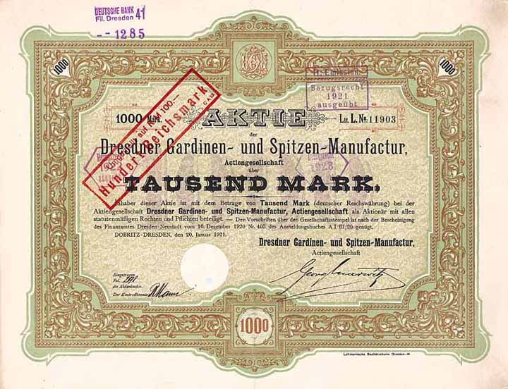 | Vorheriges Los | Zurück | Nächstes Los | | Losnr.: | 230 (Deutschland) | | Titel: | Dresdner Gardinen- und Spitzen-Manufactur AG | | Auflistung: | Aktie Lit. L 1.000 Mark 20.1.1921 (Auflage 4000, R 7). | | Ausruf: | 80,00 EUR | Ausgabe- datum: | 20.01.1921 | Ausgabe- ort: | Dresden | | Abbildung: |  | | Stücknr.: | 11904 | | Info: | Die Dresdner Kaufleute Karl Siegel und Georg Marwitz, die in Johannstadt bereits eine Bleicherei- und Appretur-Anstalt betrieben, gründeten 1884 diese AG. Der Betrieb in Dresden-Johannstadt auf der Arnold-/Blumenstraße webte nicht nur Gardinen, Spitzen, Tülle, Dekorations- und Gobelinstoffe, sondern besaß auch eine Textildruckerei, Appretur und Färberei. Die Firma expandierte ständig, deshalb 1898 Bau einer neuen Fabrik in Groß-Dobritz an der Eisenbahn Dresden-Pirna. Durch Übernahmen wurde das Unternehmen später die GRÖSSTE GARDINENFABRIK DES EUROPÄISCHEN KONTINENTS. So kamen hinzu: 1898 eine Gardinenfabrik in Warschau; 1909 eine Spitzenfabrik in Norwalk (USA); 1905 die Fa. Oertel & Co. Gardinen-, Spitzen- und Tüllweberei in Falkenstein i.V.; 1915 die Weißthaler Spinnerei AG in Mittweida; 1922 die AG für Gardinenfabrikation vorm. T. J. Birkin & Co. in Oelsnitz i.V.; 1927 die Fa. Meinhold & Sohn in Plauen i.V.; 1927 die N.V. Vitrage-Weverij en Tricotfabriek “Anglo-Holland” in Hilversum; 1929 die A. Glaser Nachf. AG in Penig. Beschäftigt waren zuletzt rd. 2.500 Menschen, exportiert wurde in die ganze Welt. Börsennotiert in Berlin und Dresden/Leipzig. Im 2. Weltkrieg überwiegend Produktion für Heereszwecke, deshalb schon 1945 auf SMAD-Befehl entschädigugslos enteignet. Bei Wiederaufnahme der Friedensproduktion im Jahr 1946 hatte die “Dregus” gerade noch 35 Beschäftigte, ein Jahr später bereits wieder über 1000. Bis Juli 1946 wurde der Betrieb dann von den Russen bis auf die letzte Schraube demontiert. Mit herbeigeschafften Reservemaschinen vogtländischer Textilbetriebe begann ein mühsamer Wiederaufbau. Zunächst landeseigener Betrieb, 1953 Zusammenlegung mit der Leipziger Spitzenfabrik und der Tüllfabrik Flöha zum VEB Tüllgardinen- und Spitzen-Werke Dresden VVB Deko. 1970 im Großbetrieb VEB Plauener Spitze aufgegangen. Ab 1990 von der Treuhandanstalt als “Dresdener Spitzen GmbH” weitergeführt.Die Mitarbeiterzahl schrumpfte beständig von 500 auf 70, der Liquidationsbeschluß war schon gefaßt, dann nahte Rettung: 1995 an einen Berliner Unternehmer privatisiert, heute die “Dresdner Gardinen- und Spitzenmanufaktur M. & S. Schröder GmbH & Co. KG”. | | Besonder-heiten: | Großformatiges Papier, sehr dekorativ gestaltet, umgestellt auf 100 RM. Lochentwertet (RB). | | Verfügbar: | R 7 | | Erhaltung: | VF | | Zuschlag: | offen |