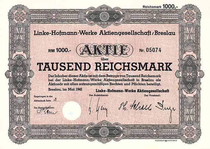 | Vorheriges Los | Zurück | Nächstes Los | | Losnr.: | 383 (Deutschland) | | Titel: | Linke-Hofmann-Werke AG | | Auflistung: | Aktie 1.000 RM Mai 1942 (Auflage 2750, R 5). | | Ausruf: | 50,00 EUR | Ausgabe- datum: | 01.05.1942 | Ausgabe- ort: | Breslau | | Abbildung: |  | | Stücknr.: | 5056 | | Info: | 1839 erhält Gottfried Linke in Breslau seinen ersten Auftrag für den Bau von 100 offenen Güterwagen. Das Werk wächst rasend schnell. 1912 wird die Linke KG mit der 1871 gegründeten "Breslauer AG für Eisenbahn-Wagenbau" zur Linke-Hofmann-Werke AG vereinigt, 1928 Fusion mit der Waggon- und Maschinenfabrik AG vorm. Busch in Bautzen zur “Linke-Hofmann-Busch AG”. 1934 Neugründung der AG und Übernahme der Werke Breslau und Warmbrunn der Linke-Hofmann-Busch AG. Erzeugnisse: Güter- und Spezialwagen, Personen- und Straßenbahnwagen, Triebwagen, Schlaf-, Speise und Salonwagen, Omnibusaufbauten. 1936 Beteiligung an der Gründung der Schlesische Flugzeug-Reparaturwerft GmbH durch Einbringung des Werkes Pöpelwitz (1938 abgestoßen). Danach verzweigte sich die Firmengeschichte: In dem Breslauer Werk nahm man nach dem 2. WK den Lokomotivbau wieder auf: die polnische Firma Fabryka Wagonów PAFAWAG lieferte fortan Fahrzeuge für die PKP. Dieses Werk in Wroclaw wurde 1997 von Adtranz, Berlin (ab 2000/01: Bombardier), übernommen. Gefertigt wurden hier jetzt u.a. die Lokomotivkästen für die Deutsche Bundesbahn. Doch auch in Westdeutschland ging die Firmengeschichte weiter: Die später zum Salzgitter-Konzern gehörende Linke-Hofmann-Werke AG wurde zunächst 1948 nach Düsseldorf verlagert und 1955 in eine GmbH umgewandelt. Auf einem 123 ha großen Areal in Salzgitter-Watenstedt (in direkter Nachbarschaft des Salzgitter-Stahlwerkes) entsteht ab 1950 eine der größten Produktionsstätten für Schienenfahrzeuge in Deutschland. 1994/97 übernimmt der französische Konkurrent Alsthom die LHB-Geschäftsanteile. 1998 Umfirmierung der Linke-Hofmann-Busch GmbH in ALSTOM LHB GmbH. | | Besonder-heiten: | Lochentwertet (RB). | | Verfügbar: | R 5 | | Erhaltung: | EF | | Zuschlag: | 55,00 EUR |