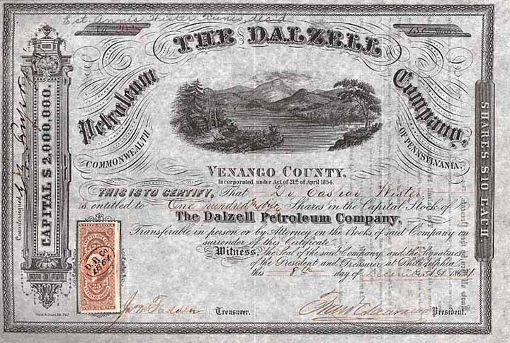 | Vorheriges Los | Zurück | Nächstes Los | | Losnr.: | 1243 (USA) | | Titel: | Dalzell Petroleum Co. | | Auflistung: | 500 shares à 10 $ 1.3.1865. | | Ausruf: | 130,00 EUR | Ausgabe- datum: | 30.11.1864 | Ausgabe- ort: | Philadelphia | | Abbildung: |  | | Stücknr.: | 2383 | | Info: | Ölgesellschaft aus dem berühmten Venango County, gegründet 1854. | | Besonder-heiten: | Sehr schöne Vignette: breiter Fluss in Berglandschaft, am Ufer ein kleiner Bohrturm. | | Erhaltung: | VF | | Zuschlag: | 130,00 EUR |