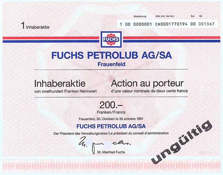 | Vorheriges Los | Zurück | Nächstes Los | | Losnr.: | 1142 (Schweiz) | | Titel: | Fuchs Petrolub AG/SA | | Auflistung: | Aktie 200 Fr. 30.10.1991. | | Ausruf: | 20,00 EUR | Ausgabe- datum: | 30.10.1991 | Ausgabe- ort: | Frauenfeld | | Abbildung: |  | | Stücknr.: | 5200 | | Info: | 1931 Gründung der Einzelfirma Rudolf Fuchs, ab 1939 Rudolf Fuchs Mineralölwerk. 1981 Gründung der Schweizerischen Fuchs Petrolub AG, Frauenfeld. 1997 wurden der deutsche und der Schweizer Teil des Konzerns wieder zusammengelegt, 1998 Umfirmierung in Fuchs Petrolub AG, Sitz Mannheim. Einer der weltweit bedeutendsten unabhängigen Schmierstoffanbieter. | | Verfügbar: | Kupons anhängend. Lochentwertet. | | Erhaltung: | EF | | Zuschlag: | offen |