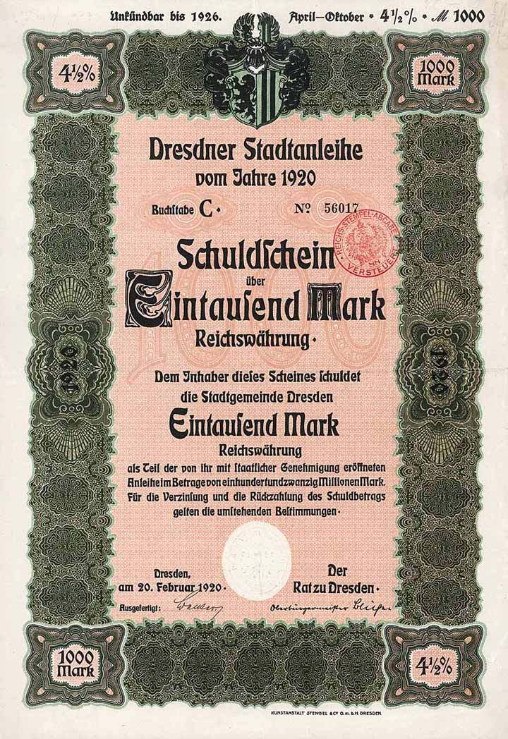 | Vorheriges Los | Zurück | Nächstes Los | | Losnr.: | 512 (Deutschland) | | Titel: | Stadtgemeinde Dresden | | Auflistung: | 4,5 % Schuldv. 1.000 Mark 20.2.1920 (Auflage 55000, R 10). | | Ausruf: | 30,00 EUR | Ausgabe- datum: | 20.02.1920 | Ausgabe- ort: | Dresden | | Abbildung: |  | | Stücknr.: | 20693 | | Besonder-heiten: | Hochdekorative Zierumrandung mit Wappenvignette. | | Verfügbar: | Rückseitig „Bestimmungen über die Stadtanleihe vom Jahre 1920“. (R 10) | | Erhaltung: | VF+ | | Zuschlag: | 30,00 EUR |