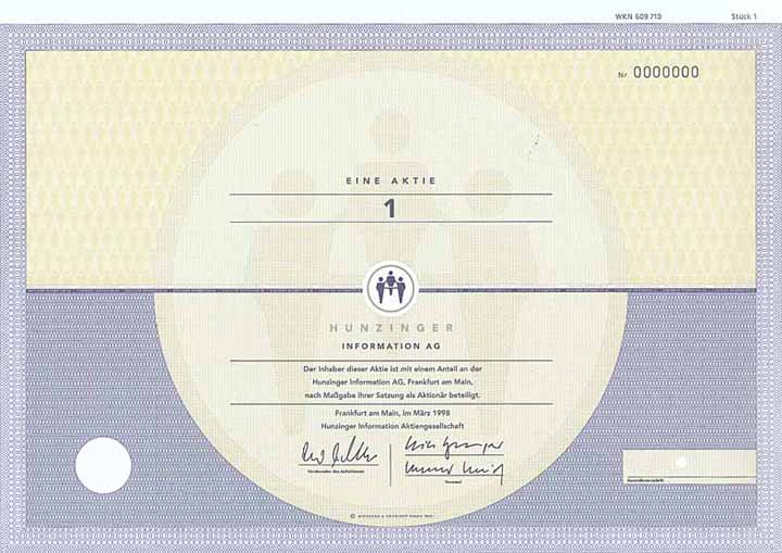 | Vorheriges Los | Zurück | Nächstes Los | | Losnr.: | 802 (Deutschland nach 1945) | | Titel: | Hunzinger Information AG | | Auflistung: | 1 Stückaktie o.N. März 1998 (nullgeziffertes Muster, R 6). | | Ausruf: | 20,00 EUR | Ausgabe- datum: | 01.03.1998 | Ausgabe- ort: | Frankfurt am Main | | Abbildung: |  | | Info: | Die 1995 in eine AG umgewandelte Hunzinger Holding GmbH wurde von Gold-Zack an den Neuen Markt gebracht. Tätig in den Bereichen Polit-Kommunikation, Public Relations, Meinungs-, Markt- und Sozial-Forschung, Marketingberatung. Der umtriebige Firmenchef Moritz Hunzinger pflegte intensive Kontakte zur großen Politik und unterstützte seine Freunde in allen Parteien gern auch einmal finanziell. Letztlich brachte ihn das in Konflikt mit dem Staatsanwalt und kostete ihn am Ende auch die Kontrolle über seine Firma. (Colorandum causa: Anlaß für den von uns nur beiläufig erwähnten „Konflikt mit dem Staatsanwalt“ war Hunzingers uneidliche Falschaussage Anfang 2004 vor dem Flowtex-Untersuchungsausschuß des Baden-Württembergischen Landtages, die staatsanwaltliche Durchsuchungen im Wirtschaftsministerium und schließlich im Sommer 2004 den Rücktritt zweier Landesminister nach sich zog. Hunzinger wurde für seine Falschaussage später rechtskräftig verurteilt. Obwohl vor diesem Hintergrund unser Beschreibungstext alles andere als starker Tobak sein dürfte, versuchte der famose Herr Hunzinger Ende 2016 allen Ernstes, uns mittels einer vom Landgericht Berlin erlassenen einstweiligen Verfügung mundtot zu machen. Allerdings am Ende vergeblich: Das Hauptsacheverfahren hat er gegen uns auf der ganzen Linie verloren.) | | Verfügbar: | Lochentwertet. (R 6) | | Erhaltung: | EF+ | | Zuschlag: | 20,00 EUR |