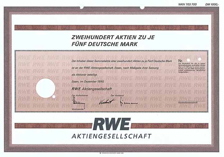 | Vorheriges Los | Zurück | Nächstes Los | | Losnr.: | 942 (Deutschland nach 1945) | | Titel: | RWE AG | | Auflistung: | Sammelaktie 200 x 5 DM Dez. 1995 (Blankette, R 10). | | Ausruf: | 50,00 EUR | Ausgabe- datum: | 01.12.1995 | Ausgabe- ort: | Essen | | Abbildung: |  | | Info: | Gründung 1898. Grundlage des Unternehmens war eine auf 40 Jahre erteilte Konzession der Stadt Essen zur Benutzung der städtischen Straßen und Plätze für die Leitungen elektrischer Energie. Die ursprünglich der "Elektrizitäts-AG vorm. W. Lahmeyer & Co." in Frankfurt a.M. erteilte Konzession wurde dem unter maßgeblichem Einfluss von Hugo Stinnes errichteten RWE abgetreten. 1899 Errichtung des ersten Kraftwerkes in Essen. Ab 1903 wurden benachbarte Kommunen nach Übernahme von Aktien und Aufsichtsratssitzen in eine überregionale Versorgung einbezogen. Im Laufe der Jahre entwickelte sich das RWE zum größten deutschen Energieversorgungsunternehmen und zu einem Konzern mit vielfältigen Aktivitäten außerhalb des angestammten Versorgungsbereichs. 1990 wurde die Gesellschaft konzernleitende Holding für die selbständigen Sparten Energie, Bergbau/Rohstoffe (Rheinbraun), Mineralöl/Chemie (RWE-DEA), Entsorgung, Maschinen- und Anlagenbau (Lahmeyer, Rheinelektra, Heidelberger Druck), Bau (Hochtief). | | Verfügbar: | Mit kpl. Kuponbogen. Abheftlochung. Lochentwertet. (R 10) | | Erhaltung: | EF+ | | Zuschlag: | offen |