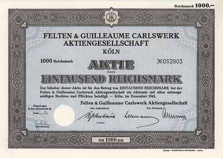 | Vorheriges Los | Zurück | Nächstes Los | | Losnr.: | 256 (Deutschland) | | Titel: | Felten & Guilleaume Carlswerk AG | | Auflistung: | Aktie 1.000 RM Dez. 1941 (Auflage 66770, R 1). | | Ausruf: | 18,00 EUR | Ausgabe- datum: | 01.12.1941 | Ausgabe- ort: | Köln | | Abbildung: |  | | Stücknr.: | 52901 | | Info: | Ursprüngliche Gründung 1826 in Köln als Hanfseilerei. 1863 trat EMIL GUILLEAUME (1846-1913) in die Fa. Felten & Guilleaume ein. Der bedeutende Eisen-, Stahl- und Kabelfabrikant gründete später auch die Osteuropäische, die Deutsch-Atlantische, die Deutsch-Südamerikanische und die Deutsch-Niederländische Telegraphen-Gesellschaft, alle mit Sitz in Köln. 1873 wurde für die Herstellung von Draht, Drahtseilen und Kabeln in Mülheim am Rhein eine Niederlassung errichtet. Dieses Zweigwerk wurde 1899 in einer AG verselbständigt. 1905 Angliederung der Frankfurter Maschinenfabrik der "Elektrizitäts-AG vorm. W. Lahmeyer & Co." und zwischenzeitliche Umfirmierung in “Felten & Guilleaume-Lahmeyerwerke AG”. Bereits 1910 wurde dieses Werk wieder abgestoßen und die alte Firmenbezeichnung wieder angenommen. Großaktionär war lange Zeit der Luxemburger Arbed-Konzern. 1979 erwarb der Philips-Konzern die Mehrheit und firmierte das Unternehmen in PKI Philips Kommunikations Industrie AG um. Unter dem alten Namen wurde für das ursprüngliche Geschäft die Felten & Guilleaume Energietechnik AG 1986 aus der PKI herausgelöst und an die Börse gebracht. | | Besonder-heiten: | G & D-Druck. Mit Firmensignet. Lochentwertet (RB). | | Verfügbar: | R 1 | | Erhaltung: | EF | | Zuschlag: | 22,00 EUR |