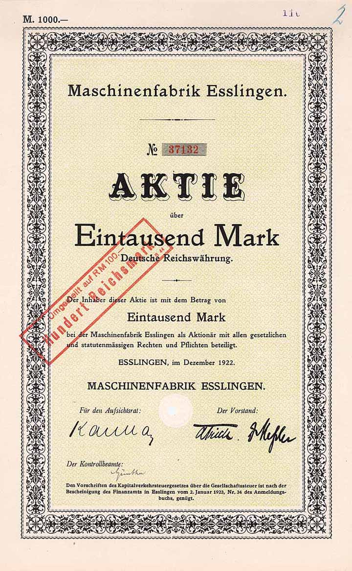 | Vorheriges Los | Zurück | Nächstes Los | | Losnr.: | 491 (Deutschland) | | Titel: | Maschinenfabrik Esslingen | | Auflistung: | Aktie 1.000 Mark Dez. 1922 (Auflage 30000, R 3). | | Ausruf: | 40,00 EUR | Ausgabe- datum: | 01.12.1922 | Ausgabe- ort: | Esslingen | | Abbildung: |  | | Stücknr.: | 39464 | | Info: | Gründung 1846, eingetragen 1866. Anfänglich auf Lokomotiven, Waggons und sonstige Eisenbahnrequisiten sowie Dampfmaschinen und Eisenkonstruktionen aller Art spezialisiert. Ende des 19. Jh. konnten mit 2500 Arbeitern knapp 100 Lokomotiven im Jahr abgeliefert werden. Später auch Fabrikation von Zahnrad- und Seilbahnen, Straßenwalzen, Eis- und Kühlmaschinen, Gasmotoren, Pumpwerken, Transmissionen, Dynamomaschinen, Elektromotoren, Kranen und Transportanlagen. Das 1897 übernommene (und 1928 an die AEG verkaufte) elektrotechnische Zweigwerk in Cannstadt plante und baute auch komplette Elektrizitätswerke. In diesem Zusammenhang bestanden Beteiligungen bei den Elektrizitätswerken in Esslingen, Urach, Freudenstadt, Tuttlingen, Metzingen und Böblingen (später in der 100 %igen Tochter “Württ. Gesellschaft für Elektrizitäts-Werke” zusammengefaßt). 1908 Errichtung eines neuen Werkes auf einem 250.000 m² großen Areal bei Mettingen, das Esslinger Fabrikareal wurde 1912 geräumt und verkauft. Das über Jahrzehnte bestehende Zweigwerk im italienischen Saronno wurde im 1. Weltkrieg verkauft (Zahlung war “ein Jahr nach Friedensschluß” vereinbart). In den 20er Jahren erwarb die Gutehoffnungshütte (GHH) die Aktienmehrheit, die 1965 an die Daimler-Benz AG weitergegeben wurde. Daimler war für seine eigene Produktion vor allem an den Fabrikanlagen und der Gießerei interessiert und pachtete diese, nachdem der Bereich Maschinenbau an die GHH verkauft worden war. Auch der Schienenfahrzeugbau wurde eingestellt, de letzte Lokomotive verließ das Werk am 21.10.1966. Noch wesentlich erweitert wurde der Werksbesitz 1983 durch verschmelzende Übernahme der “Württ. Baumwoll-Spinnerei und -Weberei” bei Esslingen a.N. und der “Maschinen- und Werkzeugbau Zuffenhausen AG”. Bis 2004 (dann Umwandlung in eine AG & Co. oHG) als reine Immobiliengesellschaft börsennotiert gewesen, heute der DaimlerChrysler Immobilien (DCI) zugeordnet. | | Besonder-heiten: | Lochentwertet (RB). | | Verfügbar: | R 3 | | Erhaltung: | EF | | Zuschlag: | offen |