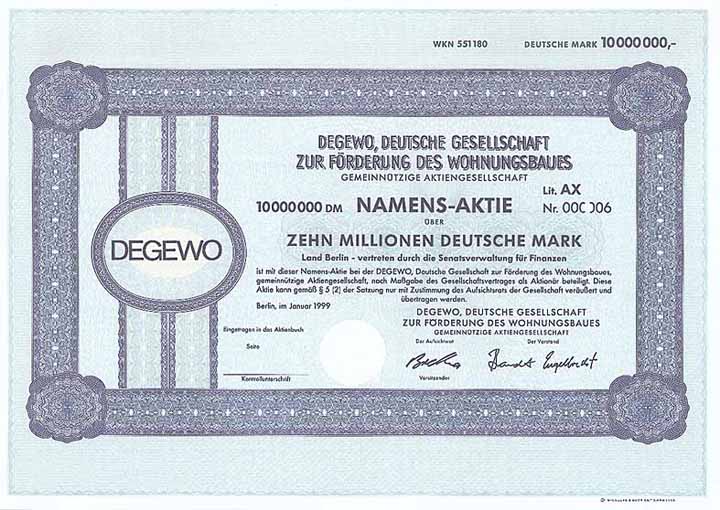 | Vorheriges Los | Zurück | Nächstes Los | | Losnr.: | 862 (Deutschland nach 1945) | | Titel: | DEGEWO, Deutsche Gesellschaft zur Förderung des Wohnungsbaues gemeinnützige AG | | Auflistung: | Namens-Aktie 10 Mio. DM Jan. 1999 (Probedruck, R 10). | | Ausruf: | 100,00 EUR | Ausgabe- datum: | 01.01.1999 | Ausgabe- ort: | Berlin | | Abbildung: |  | | Stücknr.: | 6 | | Info: | Das 1924 gegründete Unternehmen verwaltete 1943 fast 7.000 Wohnungen und Läden. 2003 Beginn der Umstrukturierung der Gesellschaft im Konzernverbund mit den Tochtergesellschaften KÖWOGE, WBG Marzahn und GEWOBE. Das Unternehmen hat Berliner Architekturgeschichte geschrieben, Wohnsiedlungen wie das Märkische Viertel und die Gropiusstadt, aber auch das Projekt Alexa am Alexanderplatz. | | Verfügbar: | Mit kpl. Kuponbogen (Nr. 11-20). Lochentwertet. (R 10) | | Erhaltung: | EF+ | | Zuschlag: | 100,00 EUR |