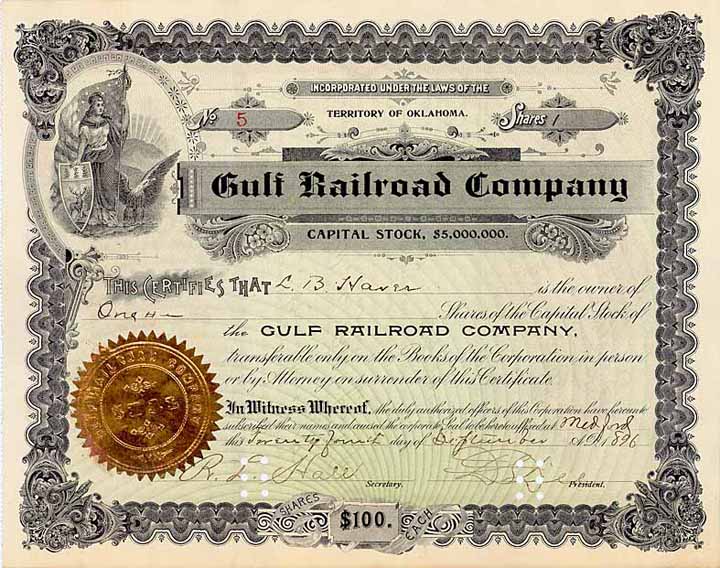 | Vorheriges Los | Zurück | Nächstes Los | | Losnr.: | 1432 (USA) | | Titel: | Gulf Railroad | | Auflistung: | 1 share à 100 $ 24.9.1896. | | Ausruf: | 150,00 EUR | Ausgabe- datum: | 24.09.1896 | Ausgabe- ort: | Oklahoma | | Abbildung: |  | | Stücknr.: | 5 | | Info: | Gegründet 1896 zum Bau der rd. 30 Meilen langen Bahn Wakita-Medford, Okla. Bereits 1898 von der Hutchinson & Southern RR übernommen worden, an deren 104 Meilen lange Strecke Hutchinson, Kan. nach Medford, Okla. die Gulf RR direkt anschloß. 1899 im mächtigen, fast 7.500 Meilen umfassenden System der Atchison, Topeka & Santa Fe Ry. aufgegangen. | | Verfügbar: | Kaum mehr als 10 Zertifikate wurden in der kurzen Geschichte der Bahn überhaupt ausgestellt. | | Erhaltung: | EF | | Zuschlag: | offen |