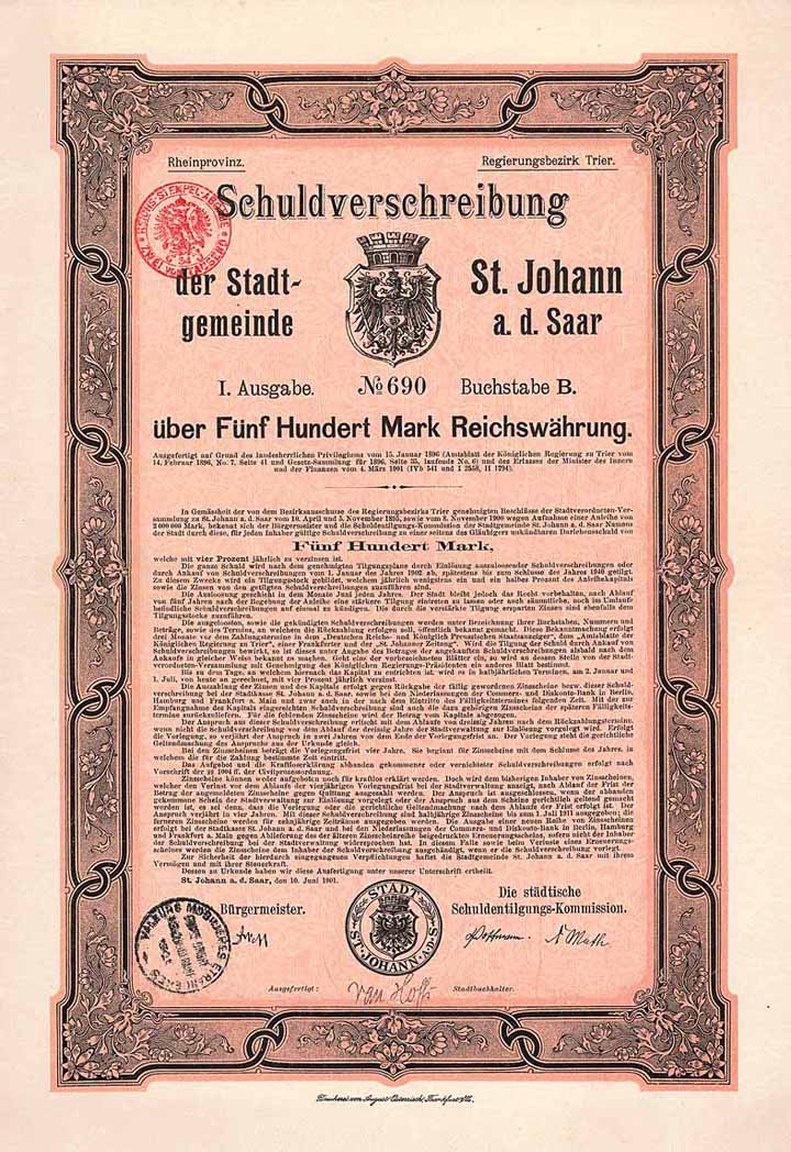 | Vorheriges Los | Zurück | Nächstes Los | | Losnr.: | 618 (Deutschland) | | Titel: | Stadtgemeinde St. Johann a.d.Saar | | Auflistung: | 4 % Schuldv. 500 Mark 10.6.1901 (R 10). | | Ausruf: | 200,00 EUR | Ausgabe- datum: | 10.06.1901 | Ausgabe- ort: | St. Johann | | Abbildung: |  | | Stücknr.: | 690 | | Besonder-heiten: | Teil einer Anleihe in Höhe von 2 Mio. Mark. Sehr schöne Umrandung. | | Verfügbar: | Mit Kupons. (R 10) | | Erhaltung: | EF- | | Zuschlag: | offen |