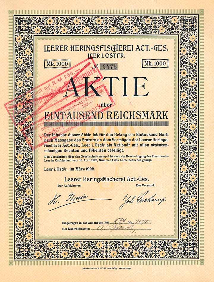 | Vorheriges Los | Zurück | Nächstes Los | | Losnr.: | 405 (Deutschland) | | Titel: | Leerer Heringsfischerei AG | | Auflistung: | Aktie 1.000 Mark März 1922 (Auflage 2000, R 5). | | Ausruf: | 40,00 EUR | Ausgabe- datum: | 01.03.1922 | Ausgabe- ort: | Leer i. Ostfr. | | Abbildung: |  | | Stücknr.: | 3453 | | Info: | Gründung 1905, Seefischfang mit anfänglich 5 Stahldampfloggern. Börsennotiz: Freiverkehr Hamburg und Bremen. 1957 Zusammenarbeit mit der Emder Heringsfischerei und der Gesellschaft Großer Kurfürst, 1961 Umwandlung in eine gemeinsame GmbH. 1969 Ende der Fangfahrten und Sitzverlegung nach Bremerhaven, 1976 Liqiudation. | | Verfügbar: | NICHT lochentwertet. (R 5) | | Erhaltung: | EF | | Zuschlag: | 40,00 EUR |