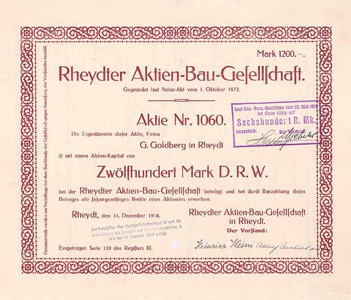 | Vorheriges Los | Zurück | Nächstes Los | | Losnr.: | 533 (Deutschland) | | Titel: | Rheydter Aktien-Bau-Gesellschaft | | Auflistung: | Namensaktie 1.200 Mark 31.12.1918 (Auflage 400, R 9). | | Ausruf: | 130,00 EUR | Ausgabe- datum: | 31.12.1918 | Ausgabe- ort: | Rheydt | | Abbildung: |  | | Stücknr.: | 1060 | | Info: | Gegründet 1872 zwecks Bau und Betreuung von Kleinwohnungen im eigenen Namen, Ziegeleibetrieb. Grundbesitz (1943; unbebaut): 102.741 qm. Häuserbesitz: Die Gesellschaft hat seit ihrem Bestehen bis Ende 1941 insgesamt 969 Häuser errichtet, davon befanden sich einschließlich der in Kaufanwartschaft begebenen Häuser noch 576 Häuser in eigenem Besitz. 1990/1991 Übernahme durch die Gladbacher Aktienbaugesellschaft AG und Neudefinition des Unternehmensgegenstandes dieser Gesellschaft als Zwischenholding im WCM-Konzern. 1992 Übertragung des gesamten operativen Geschäftes auf die Gladbau, Baubetreuungs- und Verwaltungs-Gesellschaft mbH. | | Besonder-heiten: | Originalunterschriften. Lochentwertet (RB). | | Verfügbar: | Nur 9 Stück lagen im Reichsbankschatz. (R 9) | | Erhaltung: | EF | | Zuschlag: | 130,00 EUR |
