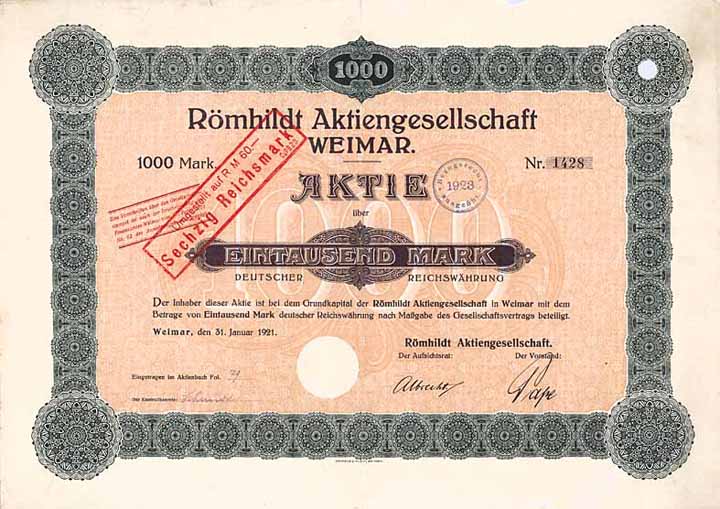 | Vorheriges Los | Zurück | Nächstes Los | | Losnr.: | 539 (Deutschland) | | Titel: | Römhildt AG | | Auflistung: | Aktie 1.000 Mark 31.1.1921 (Auflage 2400, R 8). | | Ausruf: | 70,00 EUR | Ausgabe- datum: | 31.01.1921 | Ausgabe- ort: | Weimar | | Abbildung: |  | | Stücknr.: | 1428 | | Info: | Gründung 1845, AG seit 1891 (Firma bis 1911: Römhildt-Pianofortefabrik AG, 1911-18 Römhildt-Heilbrunn Söhne AG). 1899 Neubau der Fabrik in Weimar, Hinterm Bahnhof 12, 1910 Errichtung eines großen Erweiterungsbaus. Filialen in Berlin und Hamburg. Börsennotiz: Freiverkehr Leipzig. 1930 Verkauf eines Teils des Fabrikgrundstücks in Weimar und Abtretung eines Teils der Produktion an die Pianofortefabrik A. Herrmann AG in Sangerhausen. 1931 Konkurs. | | Besonder-heiten: | Lochentwertet (RB). | | Verfügbar: | Überwiegend oben Randverletzungen. (R 8) | | Erhaltung: | VF | | Zuschlag: | offen |