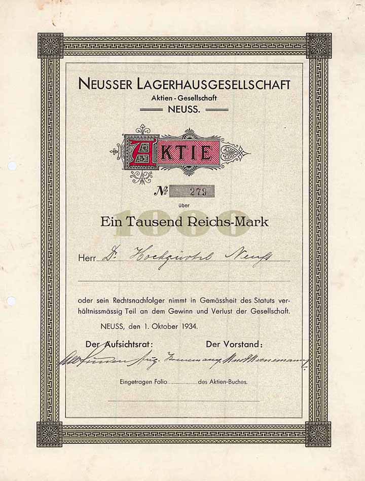 | Vorheriges Los | Zurück | Nächstes Los | | Losnr.: | 445 (Deutschland) | | Titel: | Neusser Lagerhausgesellschaft AG | | Auflistung: | Aktie 1.000 RM 1.10.1934 (Auflage NUR 50 STÜCK, R 9). | | Ausruf: | 100,00 EUR | Ausgabe- datum: | 01.10.1934 | Ausgabe- ort: | Neuss | | Abbildung: |  | | Stücknr.: | 277 | | Info: | Die 1896 gegründete Gesellschaft betrieb am Neusser Rheinhafen eine Getreideumschlagsanlage mit Silos, eine Stückguthalle und eine Umschlagsanlage mit Silo für losen Stickstoffdünger. Großaktionäre waren die Familien Koenemann und Thywissen (später Werhahn). 1993 wurde der Betrieb eingestellt. | | Besonder-heiten: | Diese Aktie stammt aus der einzigen Kapitalerhöhung. Für die Zeit ungewöhnliches Hochformat, dekorative Gestaltung. | | Verfügbar: | Abheftlochung am linken Rand. Mit beiliegendem restlichen Kuponbogen. (R 9) | | Erhaltung: | VF | | Zuschlag: | offen |