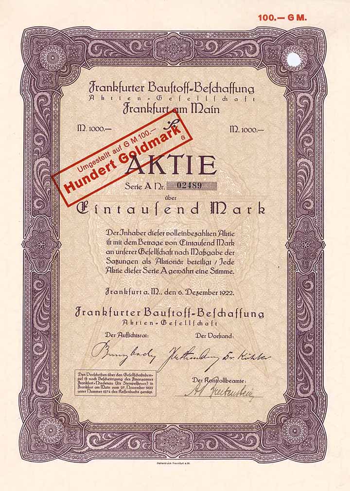 | Vorheriges Los | Zurück | Nächstes Los | | Losnr.: | 243 (Deutschland) | | Titel: | Frankfurter Baustoff-Beschaffung AG | | Auflistung: | Aktie 1.000 Mark 6.12.1922. Gründeraktie (Auflage 10000, R 3). | | Ausruf: | 38,00 EUR | Ausgabe- datum: | 06.12.1922 | Ausgabe- ort: | Frankfurt a.M. | | Abbildung: |  | | Stücknr.: | 1387 | | Info: | Gründung 1922. Herstellung von und Handel mit Dachziegeln, Stall-, Boden und Speicherplatten, Ringofensteine. 1937 Firma umbenannt in Deutsche Klinker- und Ziegelwerke AG. Sitz der Verwaltung in Meerholz, Kreis Gelnhausen. | | Besonder-heiten: | Großformatiges Papier, dekorativ gestaltet. Lochentwertet (RB). | | Verfügbar: | Oberhalb des Nennwertes stecknadelgroßer Papierverlust, sonst tadellos. (R 3) | | Erhaltung: | EF-VF | | Zuschlag: | 38,00 EUR |
