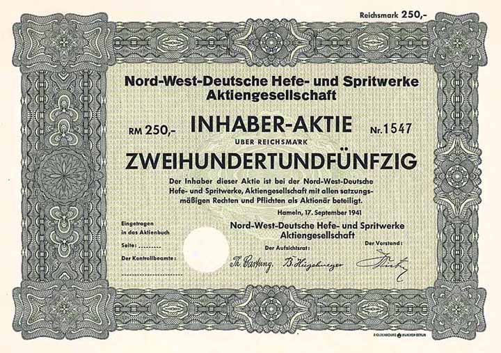 | Vorheriges Los | Zurück | Nächstes Los | | Losnr.: | 453 (Deutschland) | | Titel: | Nord-West-Deutsche Hefe- und Spritwerke AG | | Auflistung: | Aktie 250 RM 17.9.1941 (Auflage 2750, R 4). | | Ausruf: | 26,00 EUR | Ausgabe- datum: | 17.09.1941 | Ausgabe- ort: | Hameln | | Abbildung: |  | | Stücknr.: | 1546 | | Info: | Bei der Gründung 1907 (anfangs mit juristischem Sitz in Hannover, 1918 nach Hameln verlegt) übernahm eine Gruppe von Bäckermeistern eine in Hameln 1870 errichtete und seit 1895 stillliegende Zuckerfabrik einer Bremer Zuckerraffinerie. Die Hefe- und Spiritusfabrik erzeugte Hefe, Sprit, Backpulver und Puddingpulver. Um 1910 wurde in dem Fabrikgebäude außerdem eine Teppich-Weberei untergebracht. 1940 Hinzuerwerb der Hefefabrik Wilcke im ostpreußischen Rastenburg. 1974 Zusammenlegung des operativen Geschäfts in der Nordwestdeutsche HEFE-UNION (zusammen mit den Firmen R. Moormann in Werne und C. C. Christiansen in Flensburg) und 1977 Verlegung der Hefeproduktion nach Monheim. Die bis heute bestehende AG (jetzt: NWDH Holding AG) hält eine Mehrheit am hefeproduzierenden Gemeinschaftsunternehmen und ist zudem mit der Entwicklung des eigenen Grundbesitzes befaßt (vor allem der ehemaligen Fabrik in Hameln, dem HefeHof, seit 2000 eine Shopping-Mall). | | Besonder-heiten: | Lochentwertet (RB). | | Verfügbar: | R 4 | | Erhaltung: | EF | | Zuschlag: | offen |