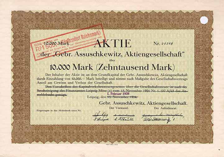 | Vorheriges Los | Zurück | Nächstes Los | | Losnr.: | 259 (Deutschland) | | Titel: | Gebr. Assuschkewitz AG | | Auflistung: | Aktie 500 RM 1.2.1938 (Auflage 350, R 7). | | Ausruf: | 50,00 EUR | Ausgabe- datum: | 01.02.1938 | Ausgabe- ort: | Leipzig | | Abbildung: |  | | Stücknr.: | 307 | | Info: | Gründung 1922. Großhandel mit Pelz- und Rauchwaren aller Art. Firmensitz war in der berühmten “Weltstraße der Pelze” am Brühl 74. Die Firma lautete bis 1936 Bülowhausverwaltung AG, danach Gebr. Assuschkewitz AG. 1940 wurde Mitteilung nach § 83 Akt.-Gesetz gemacht (Verlust hat die Hälfte des Grundkapitals überschritten). | | Besonder-heiten: | Ausgegeben auf einem Aktienvordruck über 10.000 Mark vom 15.11.1924. Lochentwertet (RB). | | Verfügbar: | R 7 | | Erhaltung: | EF | | Zuschlag: | offen |