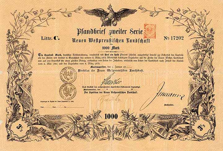 | Vorheriges Los | Zurück | Nächstes Los | | Losnr.: | 444 (Deutschland) | | Titel: | Neue Westpreußische Landschaft | | Auflistung: | 3,5 % Pfandbrief 1.000 Mark 1.1.1892 (R 10). | | Ausruf: | 50,00 EUR | Ausgabe- datum: | 01.01.1892 | Ausgabe- ort: | Marienwerder | | Abbildung: |  | | Stücknr.: | 17202 | | Info: | Die Geschichte der Landschaften begann 1769, als der Minister von Cramer von König Friedrich dem Großen beauftragt wurde, das Statut der Schlesischen Landschaft auszuarbeiten. Die Westpreußische Landschaft wurde 1787 gegründet. Weit über ein Jahrhundert lang waren die Landschaften die Stütze des Realkredits. Sie beliehen die Rittergüter und mit ihnen wurde der noch heute beliebte Pfandbrief erfunden. | | Besonder-heiten: | Querformat, schöne breite Umrahmung aus Blumen und Getreideähren. | | Verfügbar: | R 10 | | Erhaltung: | VF. | | Zuschlag: | offen |